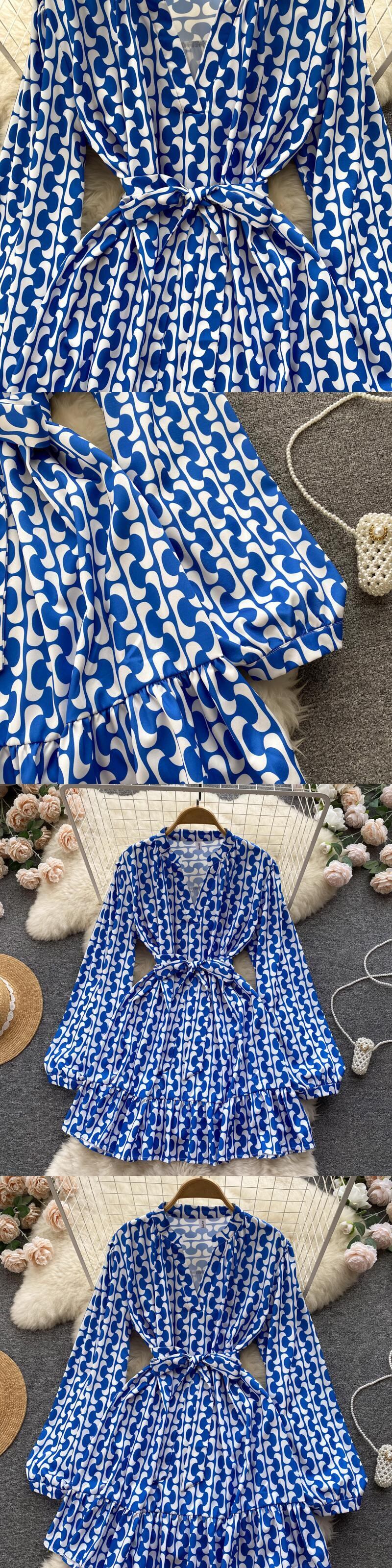 フレンチプリントオータムドレスレディースラペルVネック長袖スリムドレスネクタイウエスト調節可能なOLショートドレス ロング 秋物 アジャスタブル Abe17050116345