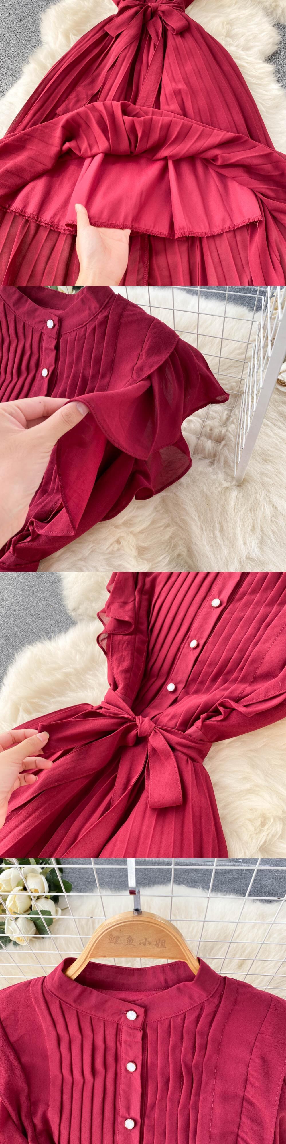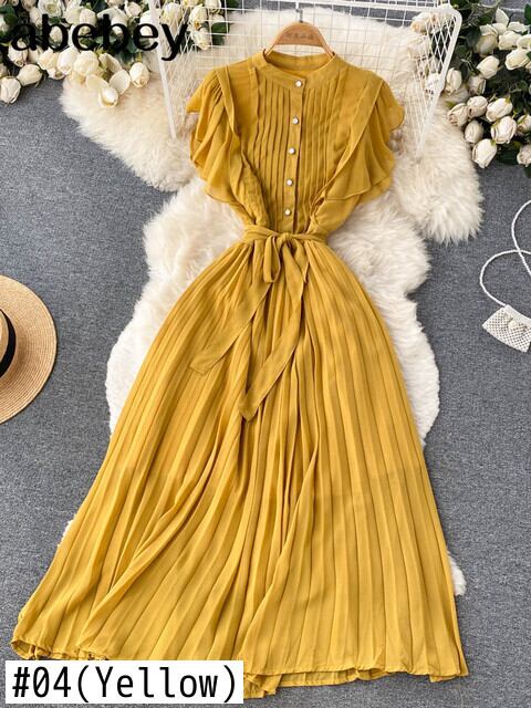 夏の女性プリーツロングドレスラウンドネックフリルスリーブウエストAラインパーティーマキシVestidos服 サマー 夏物 Oネック Abe17250555355