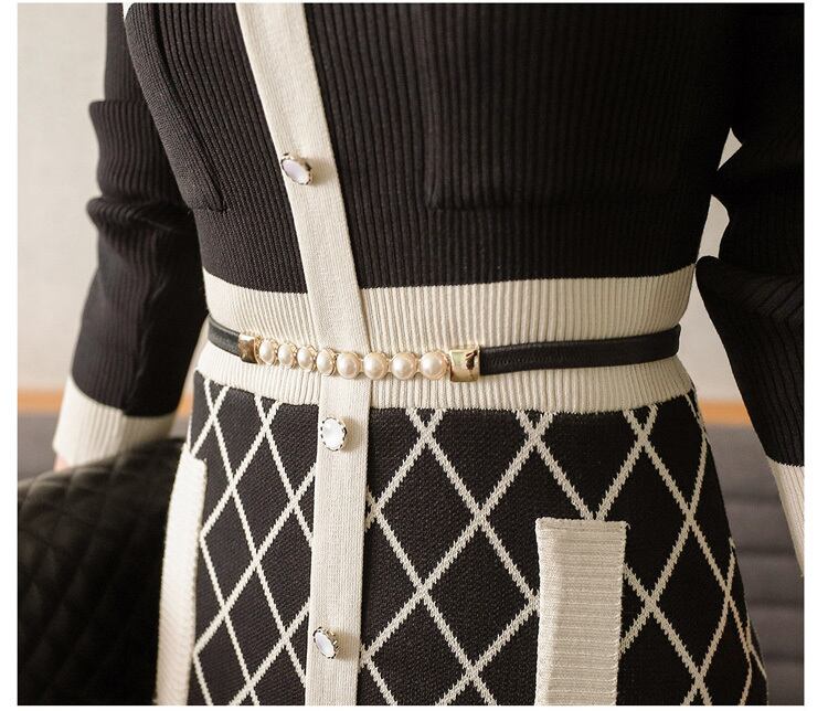 女性ニットセータードレス秋冬長袖チェック柄パッチワークVネックウエストボディコンVestidosドレス ロング オータム 秋物 ウィンター 冬物 Rhc84258089662