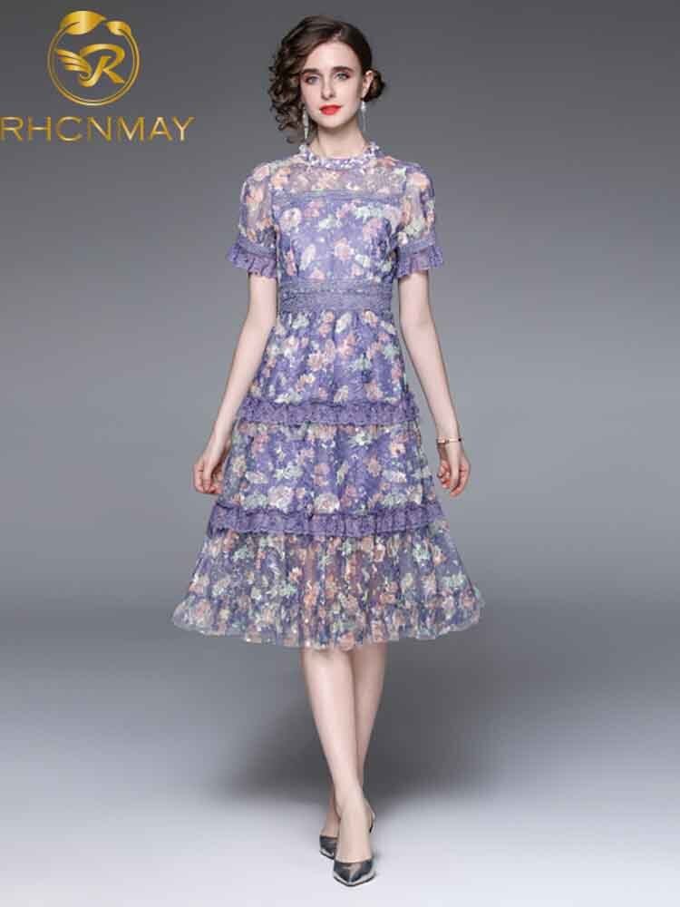2022年夏の女性のパーティーミディドレスフレアスリーブウエスト刺繡フローラルプリントメッシュドレス 刺繍 サマー 夏物 花柄 Rhc71644875101