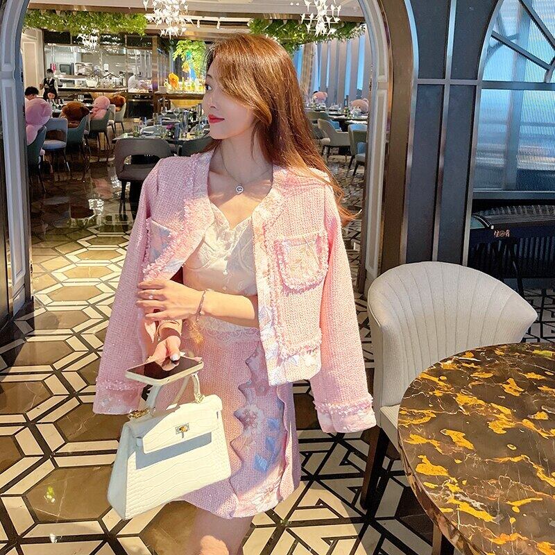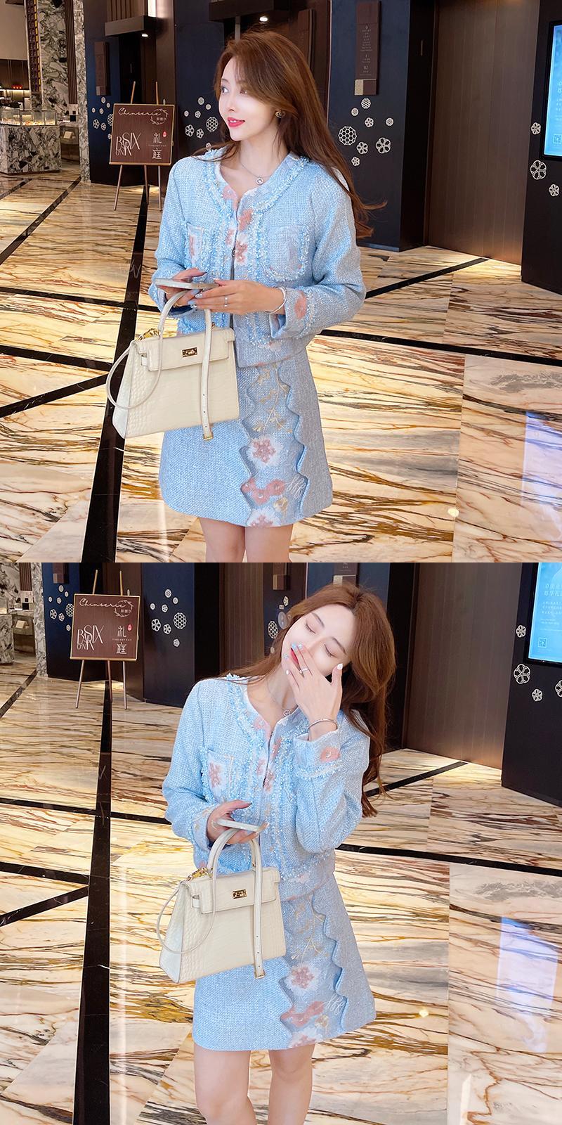 2021年秋ツイードウール刺繡レディーススーツポケット長袖Telショートコート+ミニスカート2点セット ロング 刺繍 オータム 秋物 Rhc70798037279