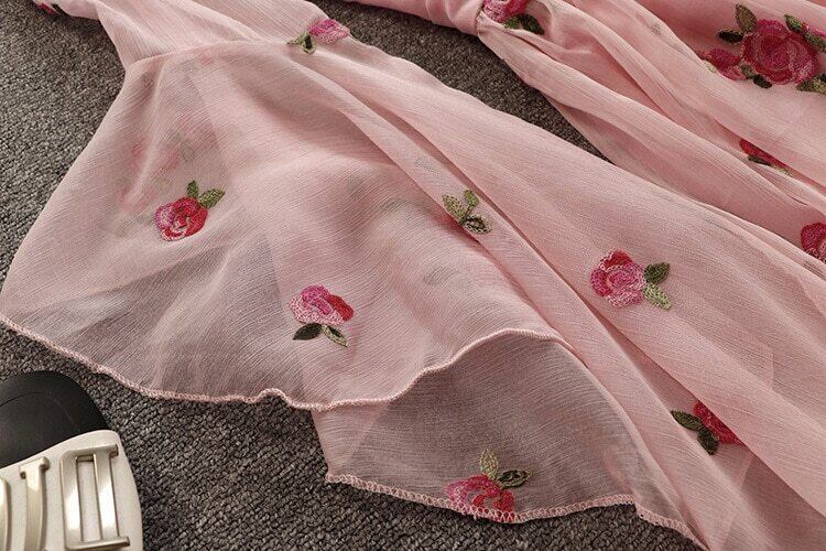 2020年夏のレディーススウィートVカラーフラワー刺繍ピンクシフォンドレススリムフレアスリーブガールズショートドレス レッド 大人ガーリー キュート カジュアル サマー 夏物 フラワーデザイン Rhc69519846135