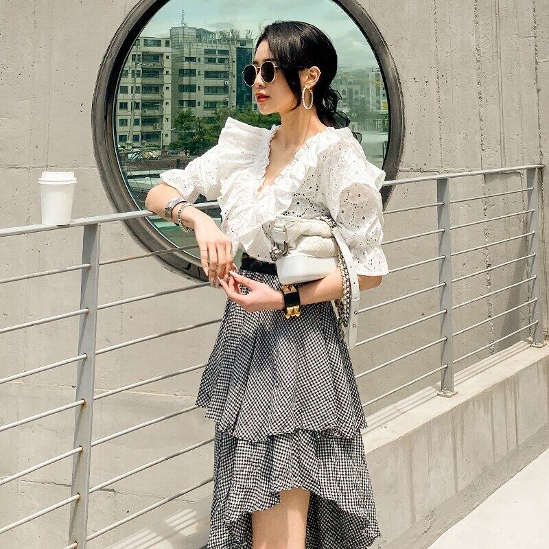 品質2020夏セクシー2ピースセット女性Vネックレースパフスリーブフリルシャツ+格子縞の不規則なスカートスーツ ラッフル サマー 夏物 Rhc48891542487