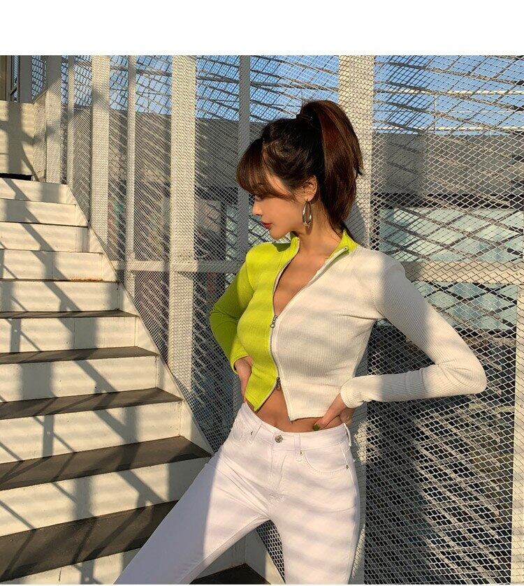 2020グリーンジップアップパッチワークカーディガンコートセーターリブ編み長袖ストレッチセクシーな女性サマートップスストリートウェア ロング 夏物 Rhc83904534289