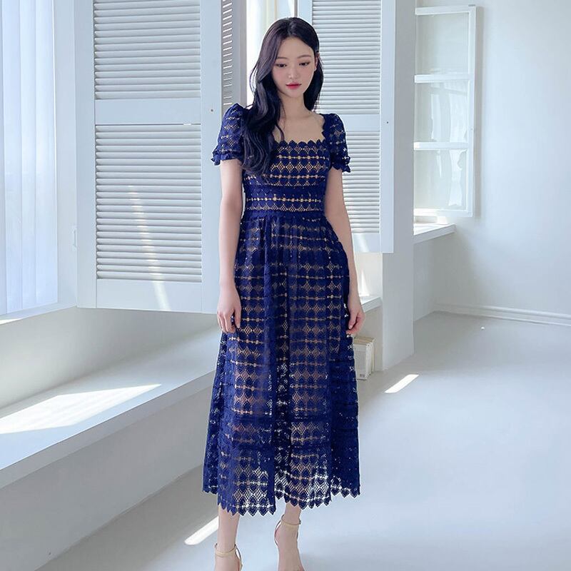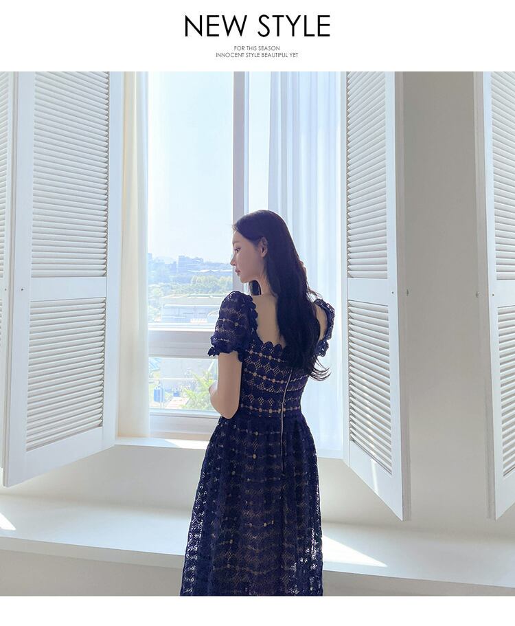 女性サマースクエアカラーリーキーバックスリムロングドレス2021estパフ半袖レースホローアウトルーウェイドレス ショート ハーフスリーブ 夏物 スクウェア Rhc71378753296