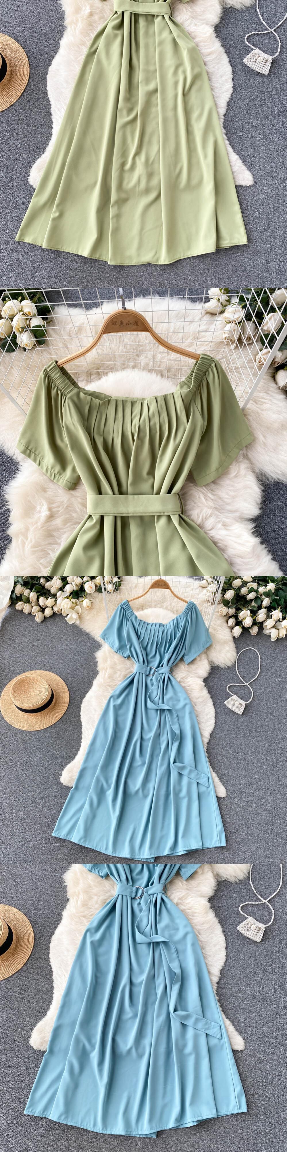 スウィートソリッドドレスレディースグリーンスクエアカラー半袖Aラインドレスサマーボヘミアンビーチサンドレスエレガント ショート ハーフスリーブ 大人ガーリー キュート カジュアル 夏物 ソリッドカラー スクウェア Abe24596793701