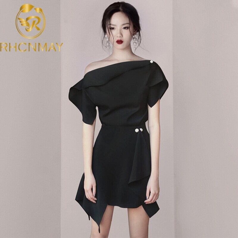 2020 Summer Women Runway 2 PCS Set Sexy Black Ruffles Off Shoulder Shirt Tops + Beading Irreguls Skirts Set ブラック フリル ラッフル サマー 夏物 スカート オフショルダー Rhc54758530012