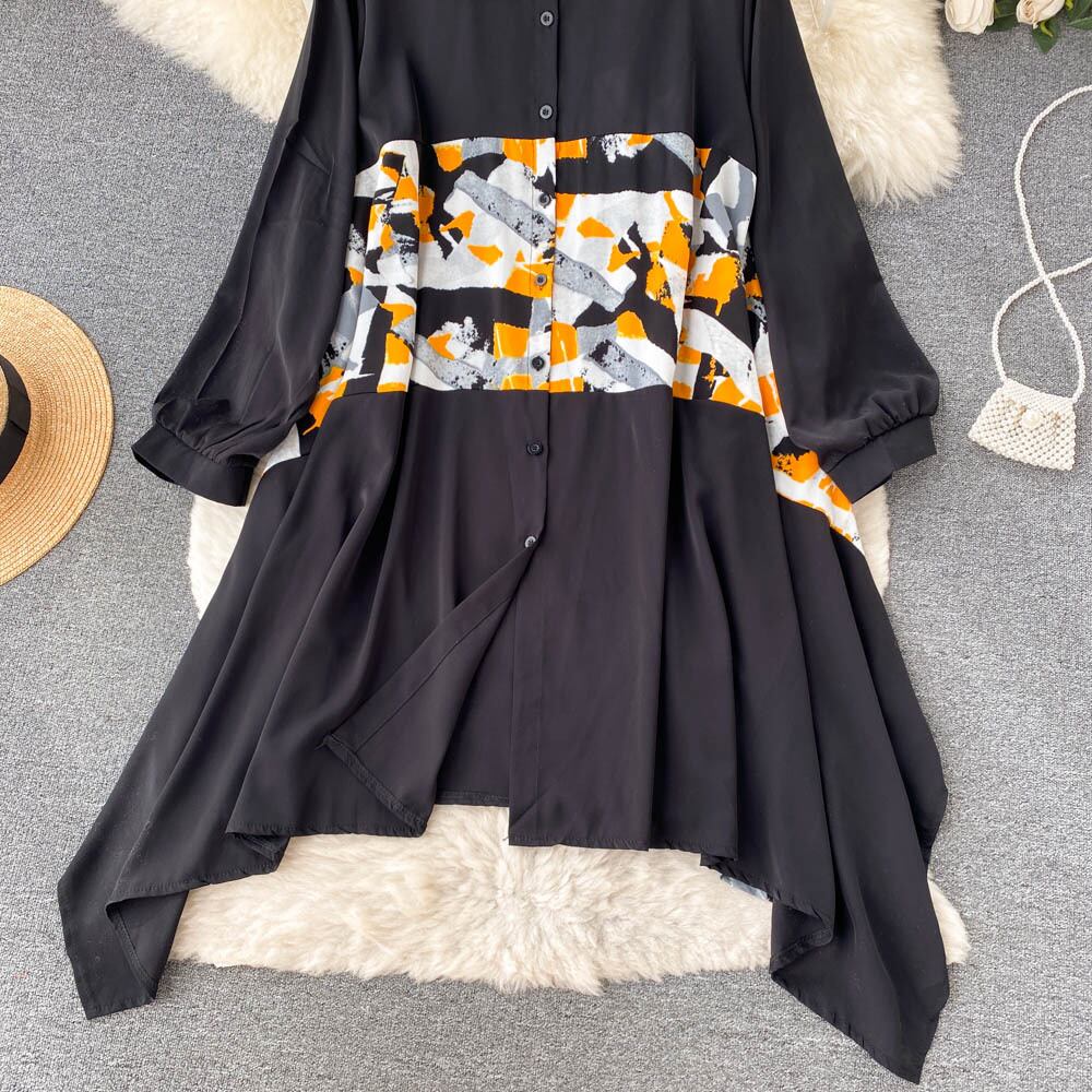 夏の滑走路不規則なプリーツドレス女性の長袖シャツ襟オーバーレイフラワープリントスリムパーティーミディドレス ロング サマー 夏物 フラワーデザイン Abe28736636177