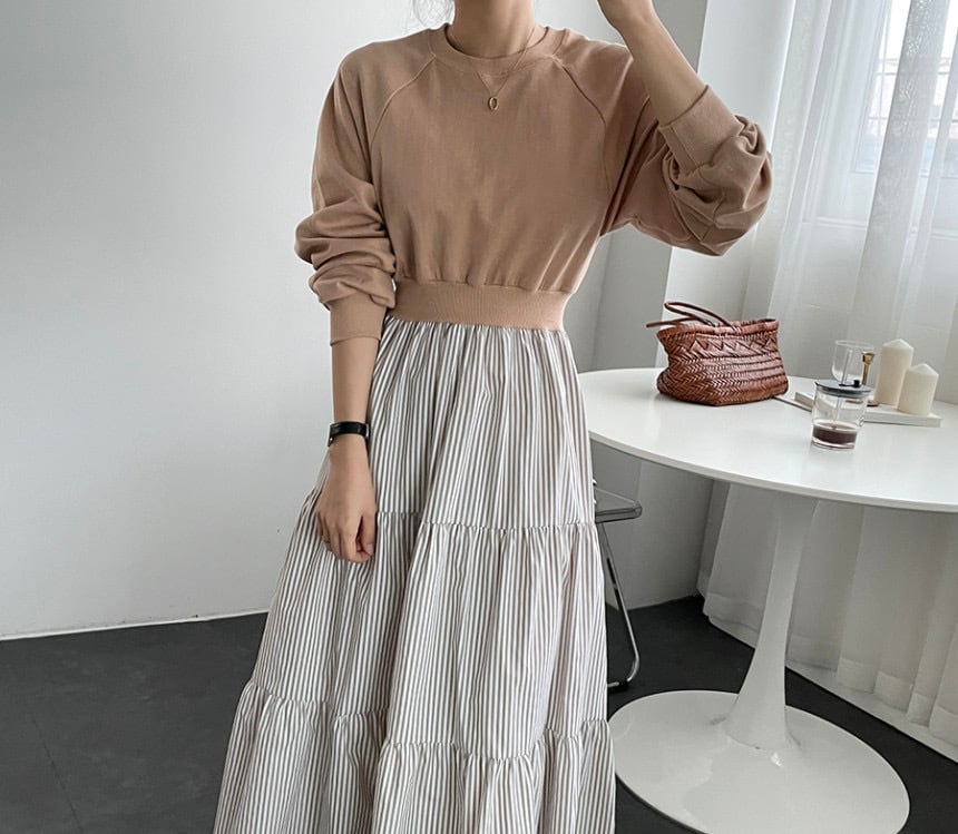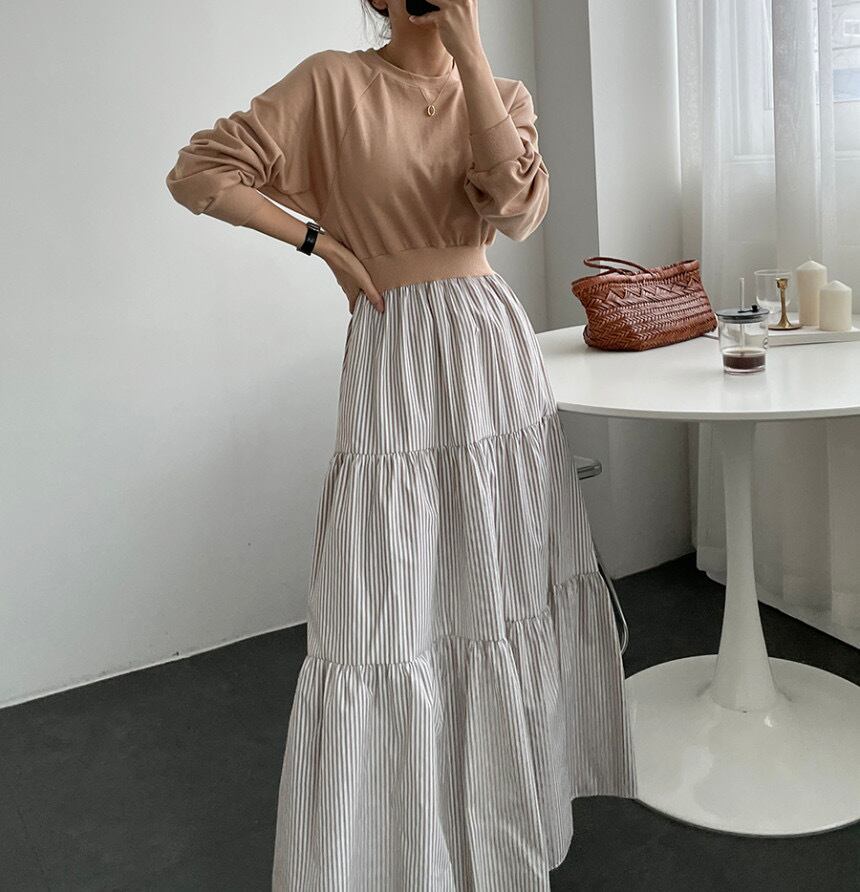 ワンピース春秋ワンピース2021ニッチラウンドネックプルオーバールーズセーターステッチストライプロングワンピース スプリング 春物 オータム 秋物 ドレス Oネック Rhc19678410637