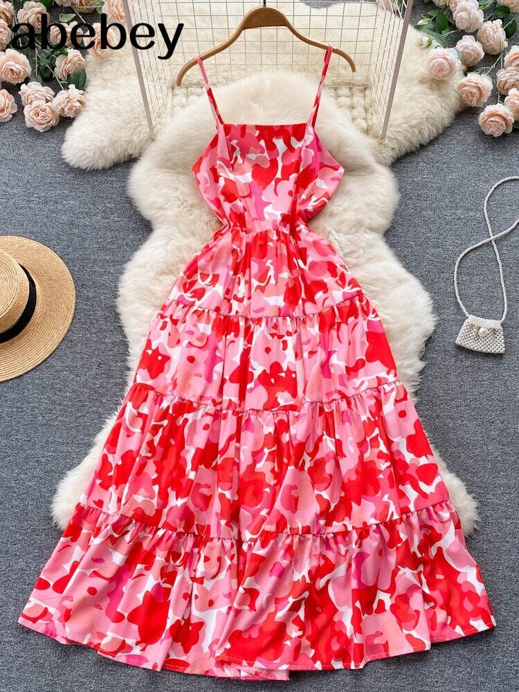 夏のセクシーなスパゲッティストラップフローラルプリントマキシドレス女性2022チェストラップロングウーマンビーチドレスホリデー サマー 夏物 花柄 Abe92561664623