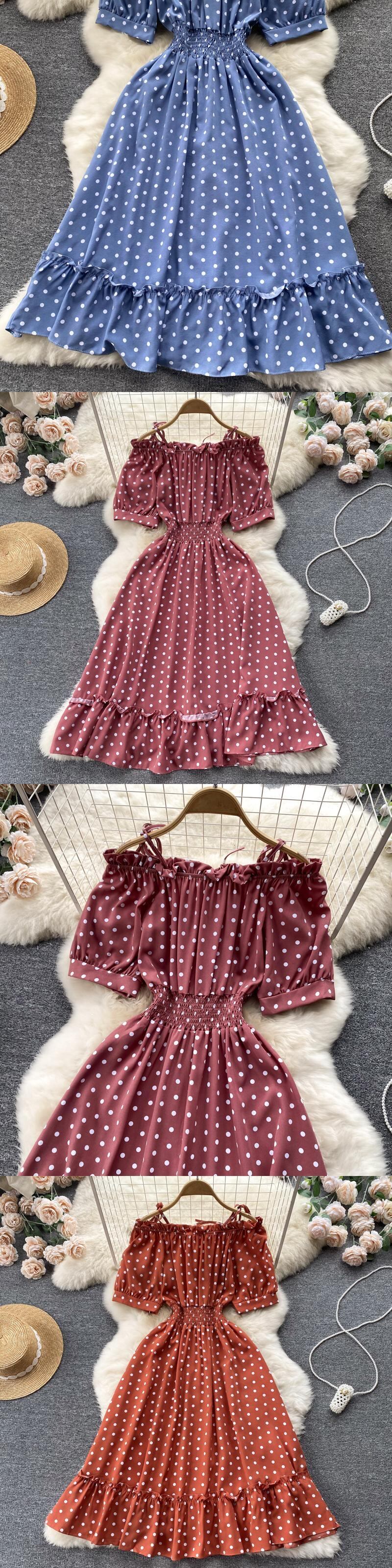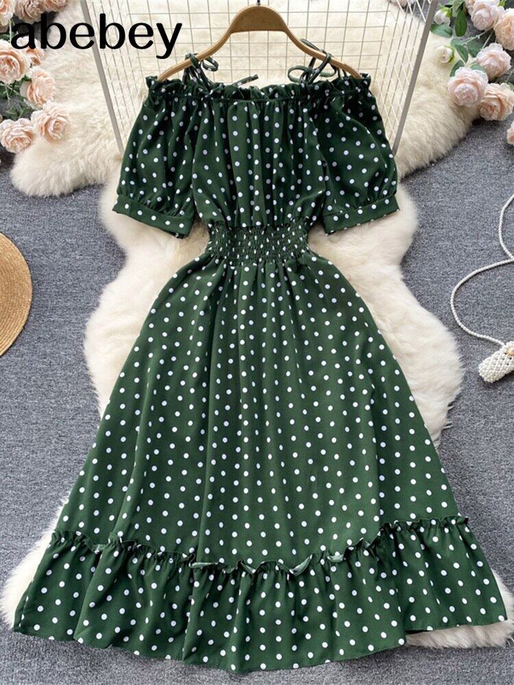 グリーンサマースウィートスラッシュネックポルカドットドレスレディースオフショルダー半袖ウエストAラインスリムフリルVestidos ショート ハーフスリーブ 大人ガーリー キュート カジュアル 夏物 Abe17846578682