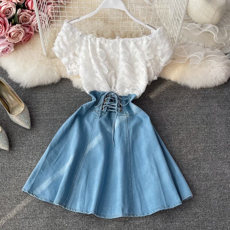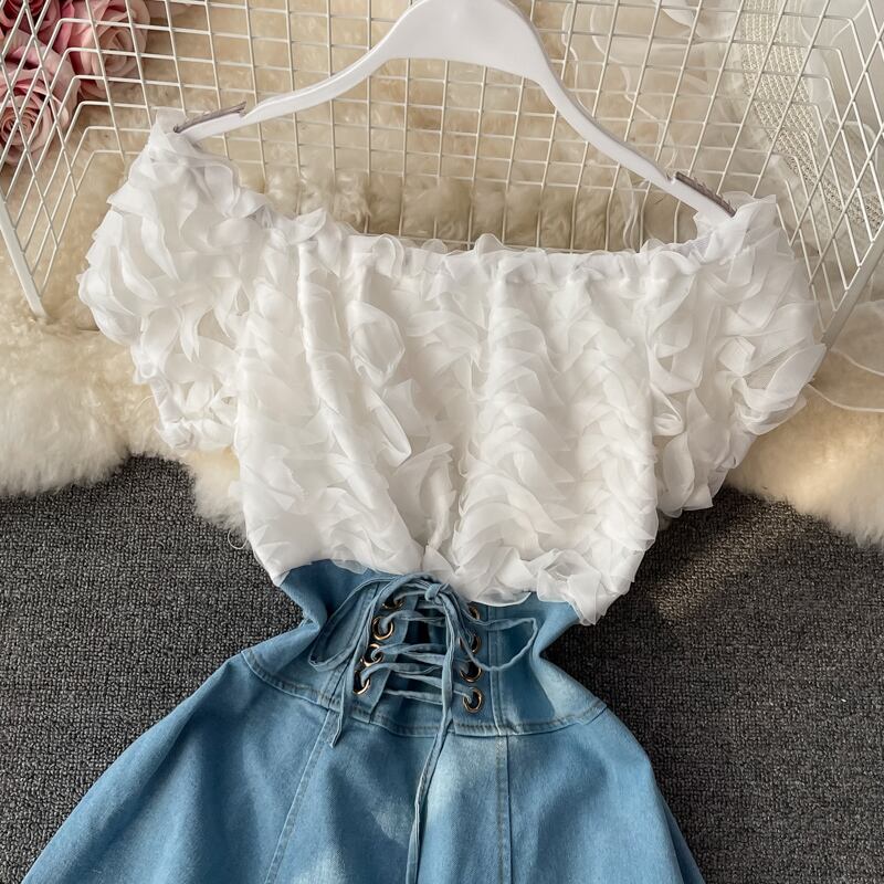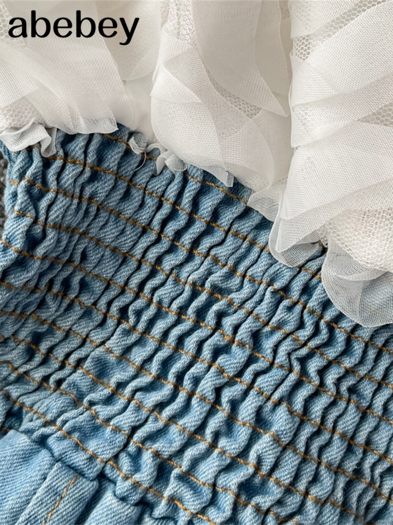 デニムドレス2022半袖女性ドレス服ガーゼパッチワークVestidosフリルオフショルダーローブ ショート ハーフスリーブ ラッフル Abe14110876566