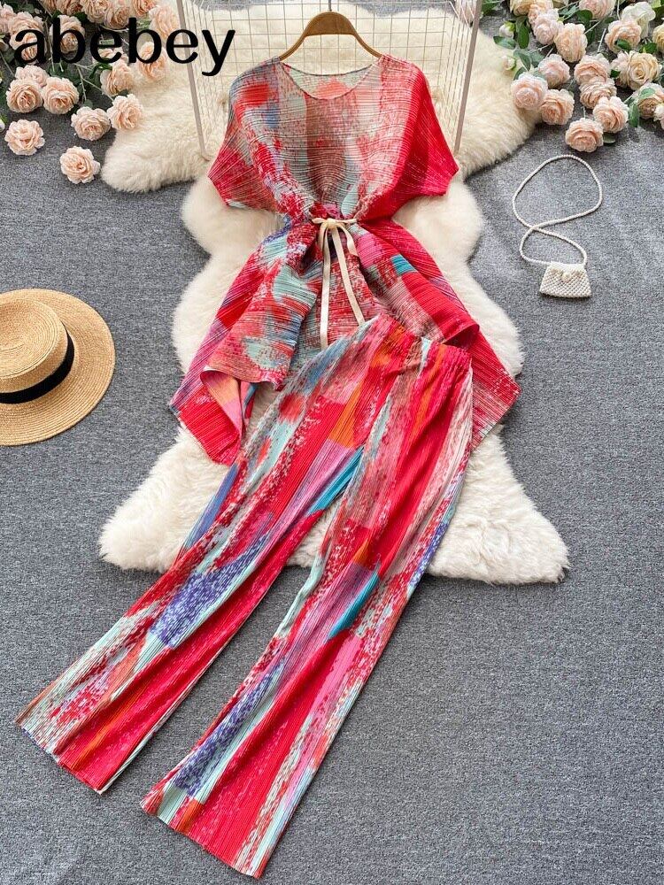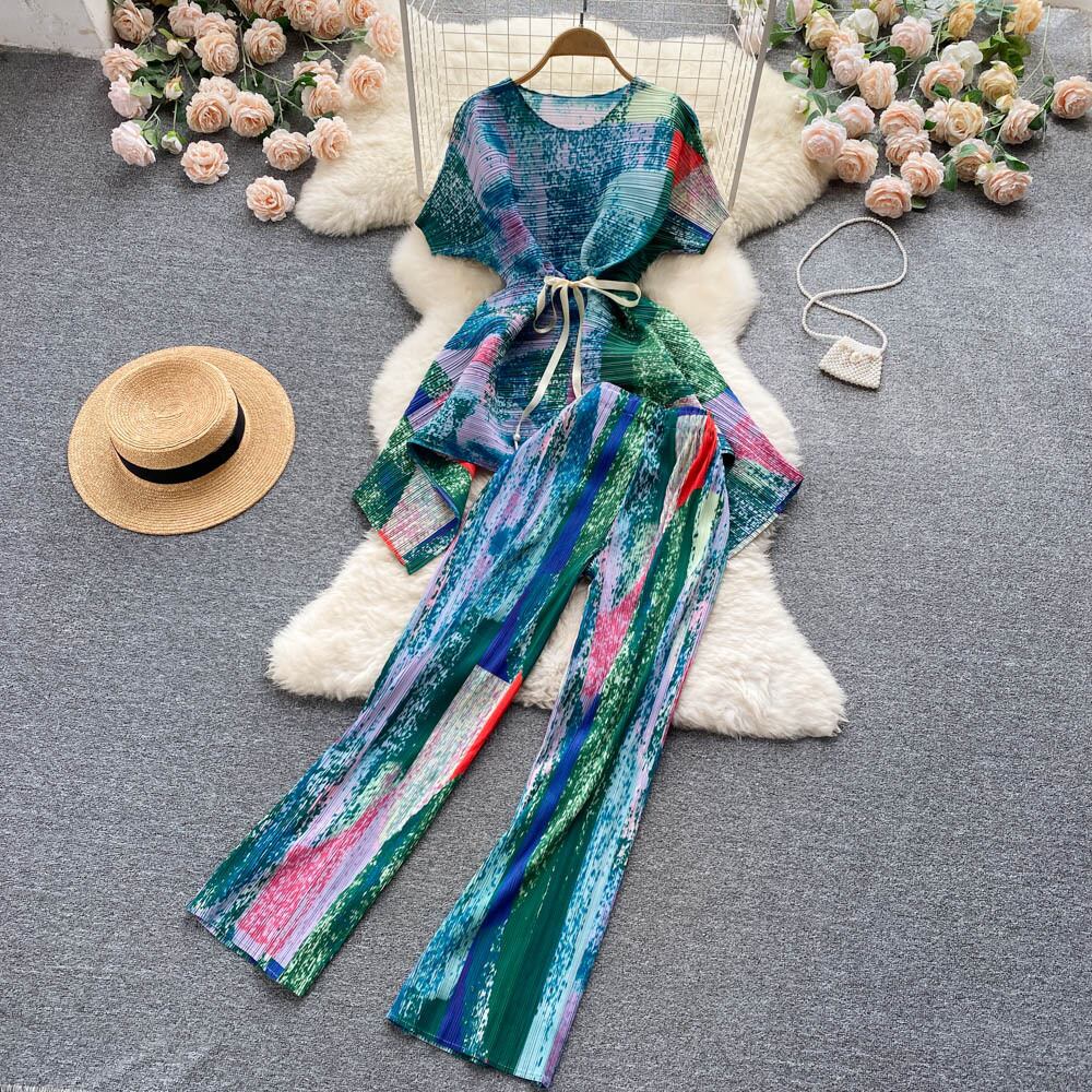 タイダイカジュアルルーズホームスーツ秋の長袖ブラウス、ワシットパンツセット女性プリーツベージュ2ピースパンツセット ロング オータム 秋物 Abe26806266905