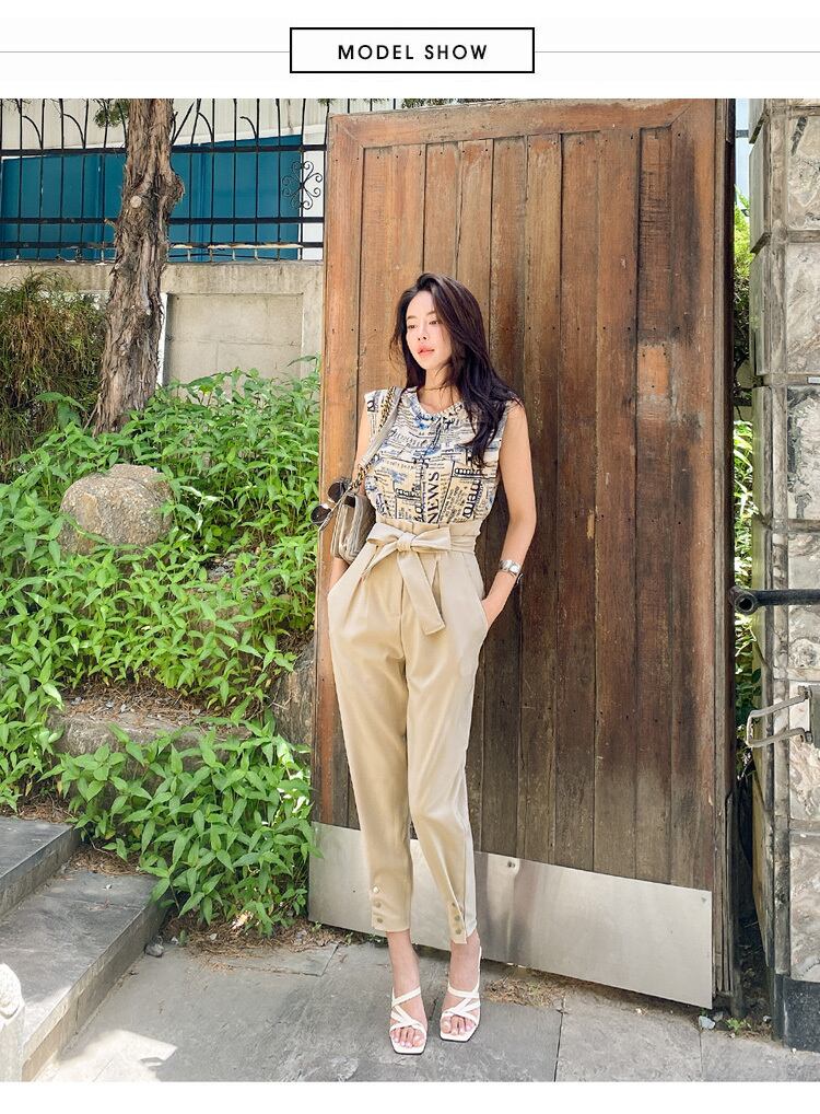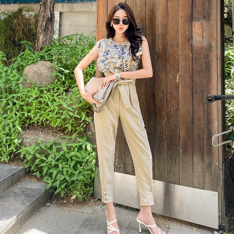 シンプルなツーピーススーツ女性2021年夏のプリントレタートップ&ボウウエストロングパンツOLワークパンツスーツ リボン サマー 夏物 Rhc46493125817