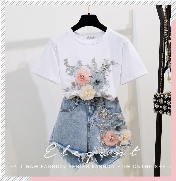 2020年夏の女性2点セット刺繡3DフラワーTシャツ+デニムショートパンツセットビーズショーツセット 刺繍 サマー 夏物 ブルマー フラワーデザイン Rhc74077613210