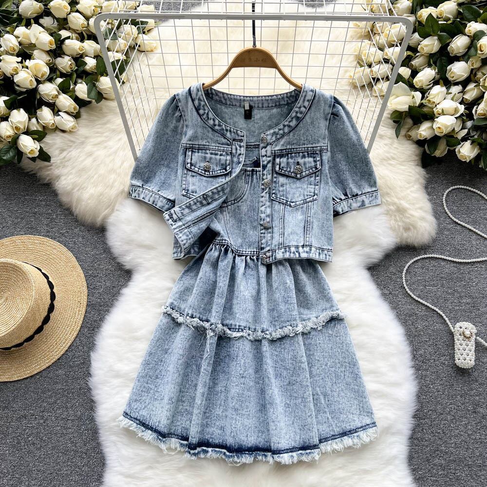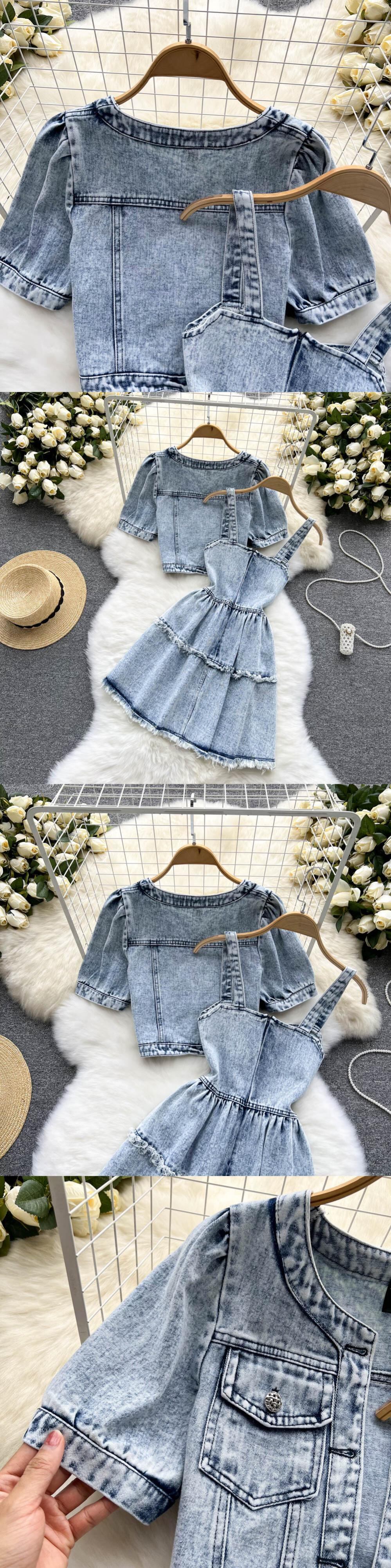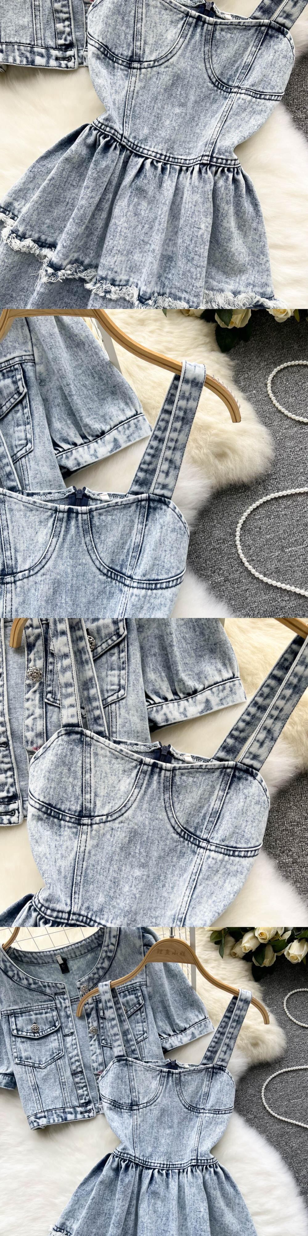 女性サマーセットソリッドセクシーノースリーブストラップデニムドレス+半袖ジャケットトップツーピーススーツ ショート ハーフスリーブ 夏物 ソリッドカラー Abe72372181732
