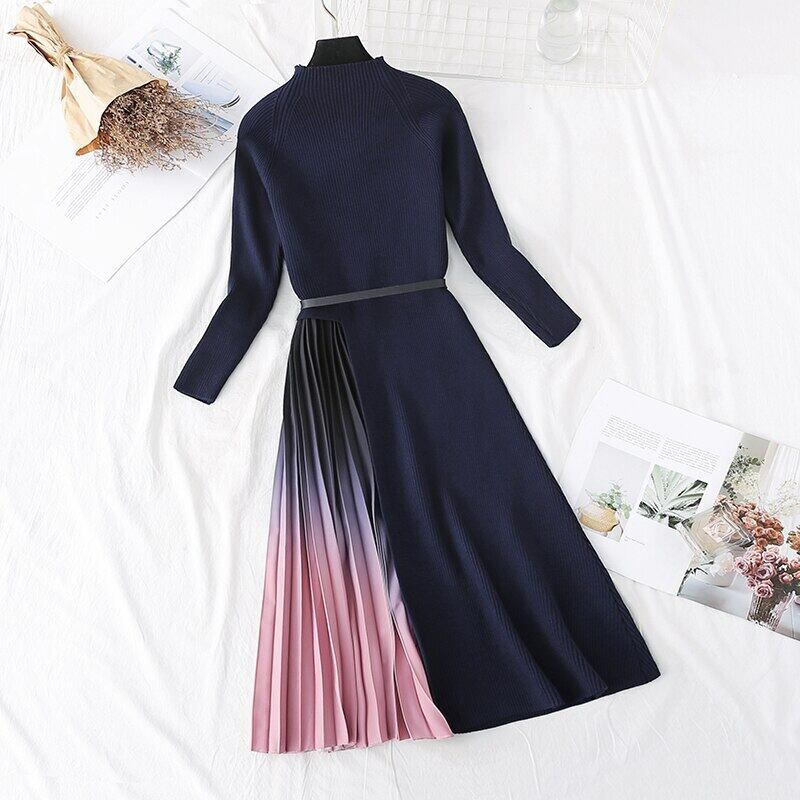 2021ニットパッチワークグラデーションピンクプリーツドレス女性長袖セーターオフィスベルト付きワンピースミディドレス ロング ハーネス 会社 学校 通勤や通学にも Rhc86354493606