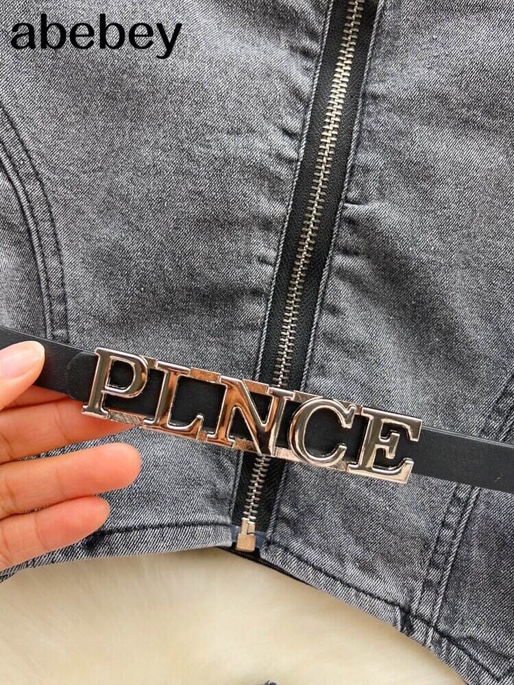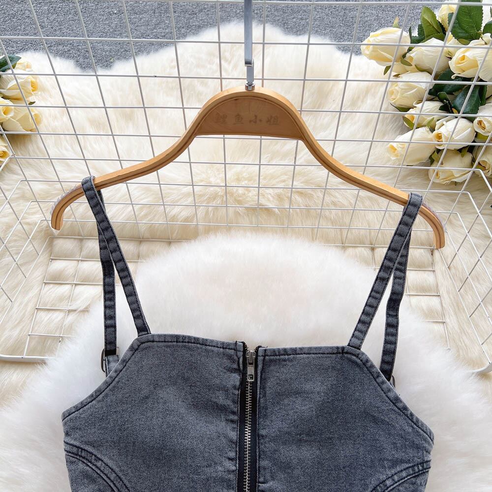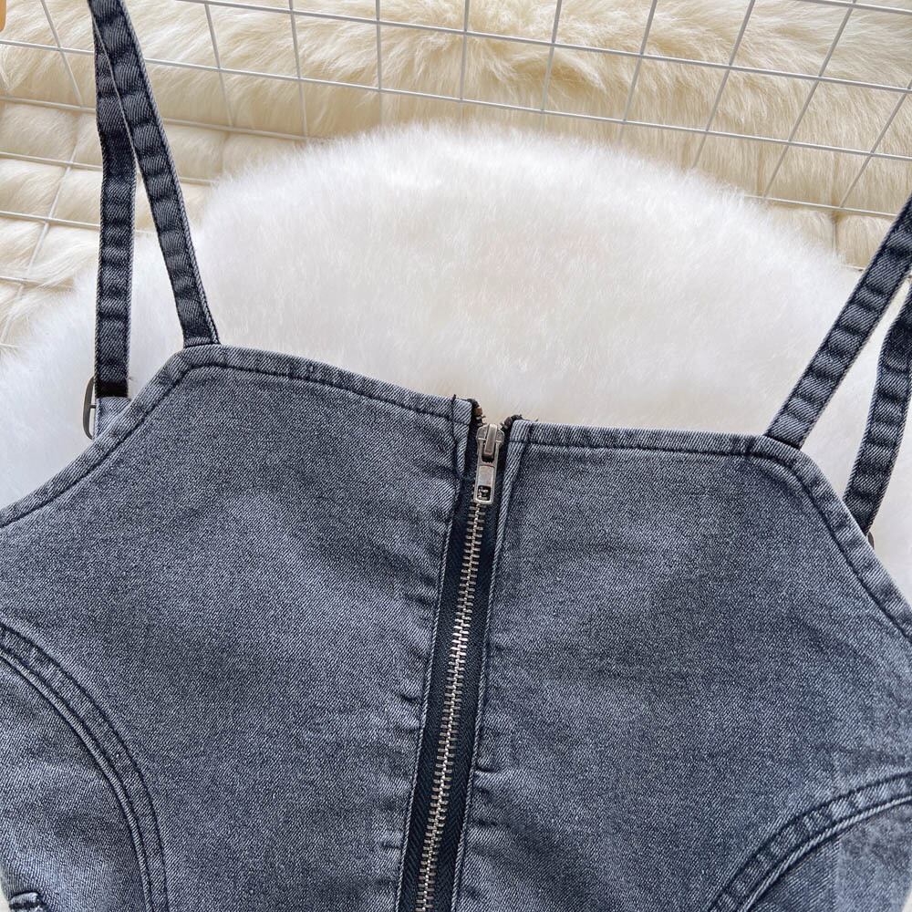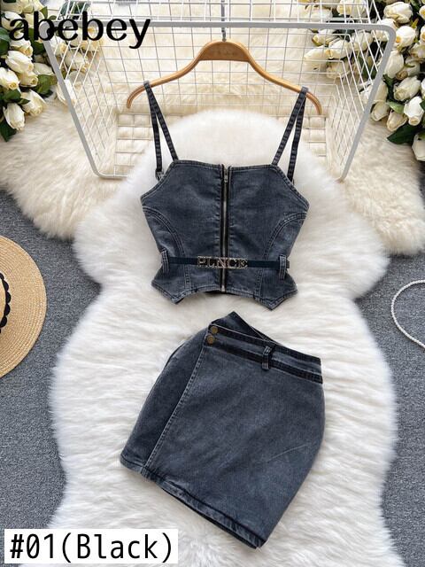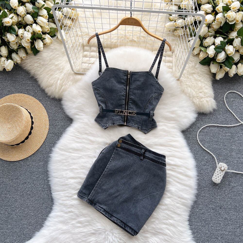 デニムセクシーな女性セット2022夏のジッパースラッシュネックトップサッシュミニスカートスリムツーピースセットの衣装 サマー 夏物 Abe25779391094