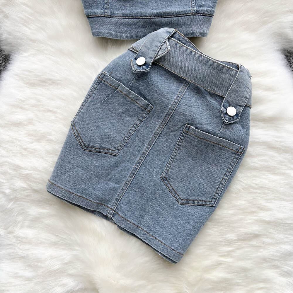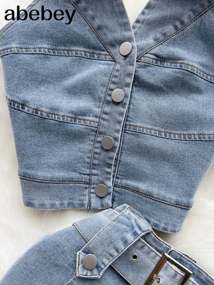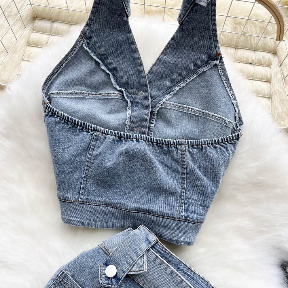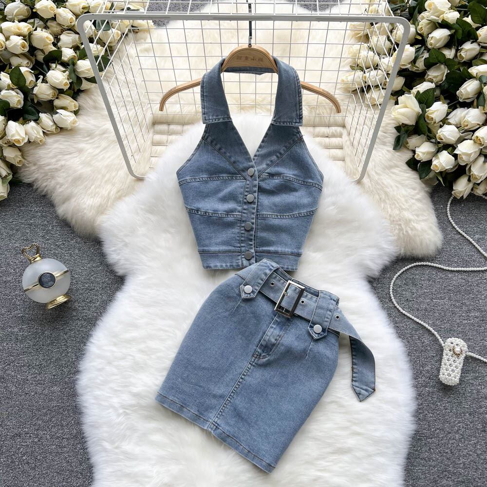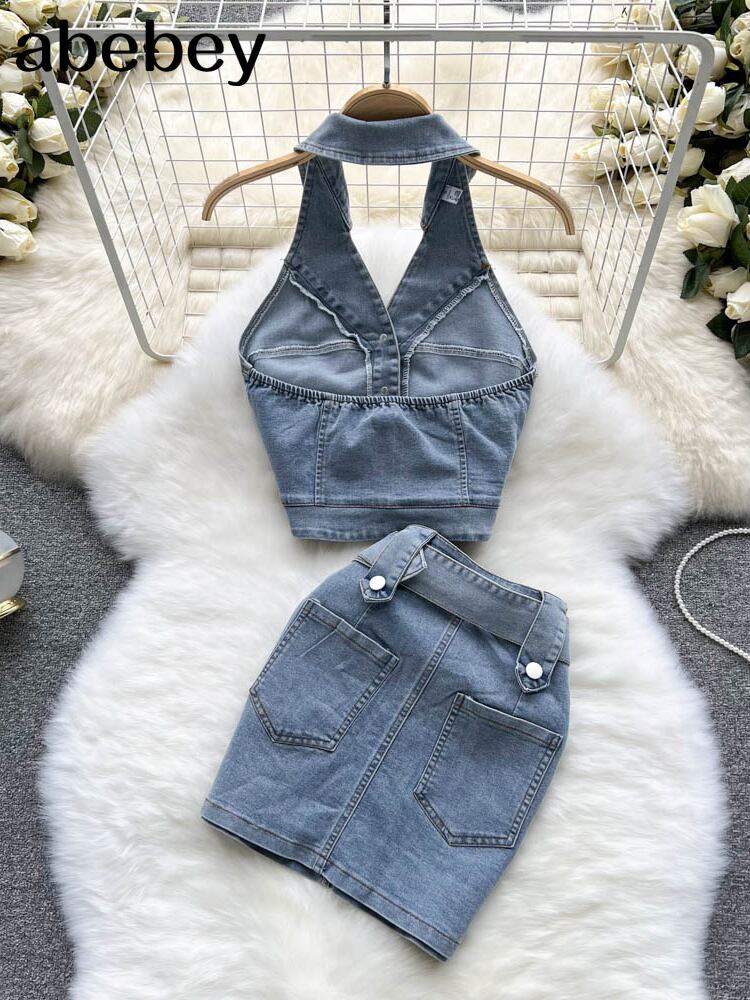 2022年夏のセクシーなノースリーブストラップホルター中空アウトデニムトップショートミニスカートツーピースセット女性 サマー 夏物 Abe38118164452