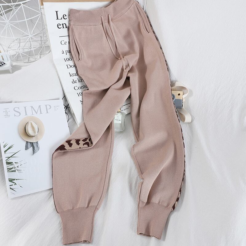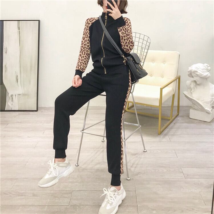 ツーピーストラックスーツ長袖コートとズボンヒョウパッチワークニットスーツセット2020秋 ロング オータム 秋物 Rhc43848170609