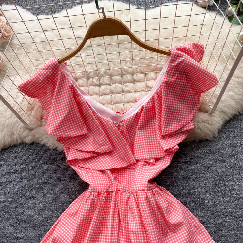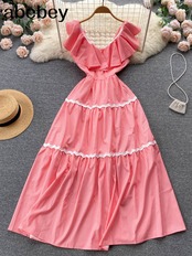 夏のボヘミアン女性プリントピンクマキシロングドレスセクシーなVネックフリル半袖ウエストバケーションビーチVestidos ショート ハーフスリーブ サマー 夏物 Abe32492614910