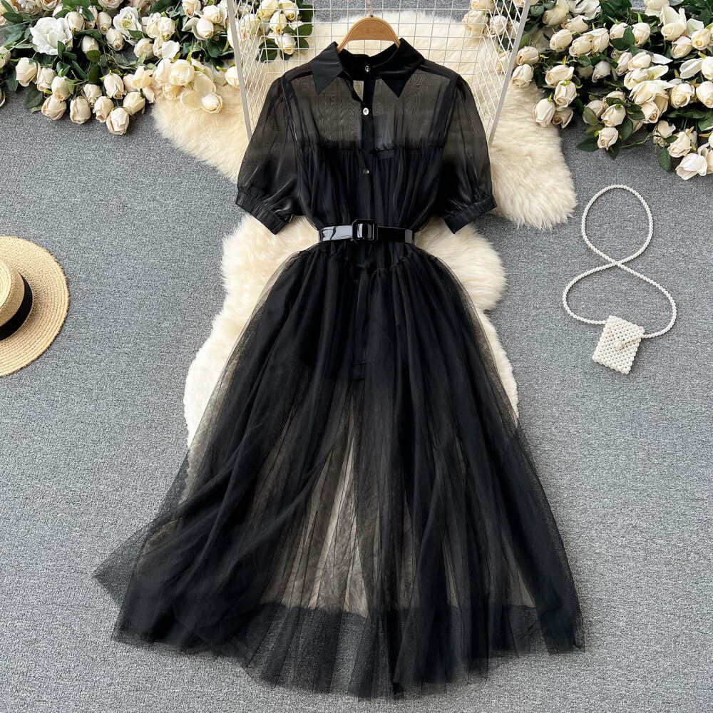 夏のパッチワークドレープドレスシースルーウエスト半袖プリーツシャツVestidosベルト付き ショート ハーフスリーブ サマー 夏物 ハーネス Abe77953022915