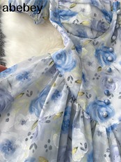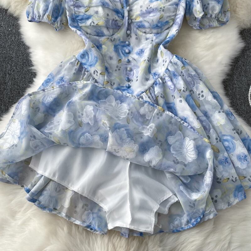 夏の女性プリーツシフォンミニドレスフローラルスクエアカラー半袖ドレープAライン ショート ハーフスリーブ サマー 夏物 花柄 スクウェア Abe98703942449