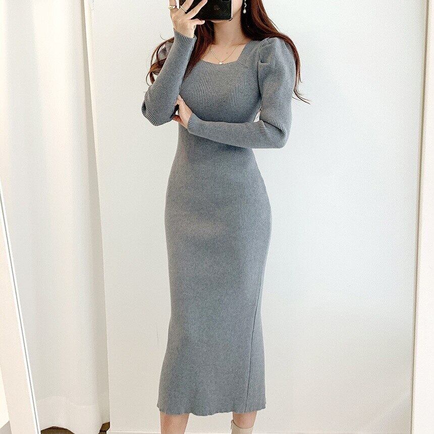 シックなパフスリーブ秋のオフィススタイルレディ2021プロモーショングレーの女性のドレスニットウエストスプリット可能なドレス オータム 秋物 会社 学校 通勤や通学にも Rhc25078378637