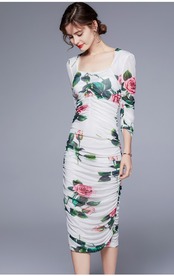 女性サマーオフィスミディドレスハーフスリーブドレープフローラルプリントメッシュペンシルドレス 半袖 夏物 花柄 会社 学校 通勤や通学にも Rhc38621573789