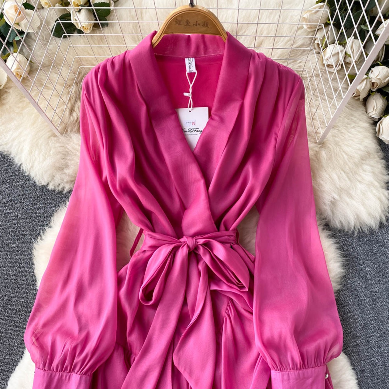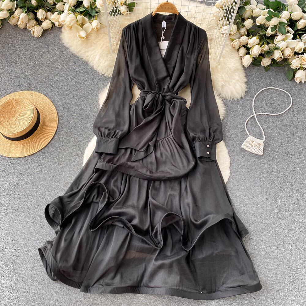 秋の女性不規則なフリルパーティーロングドレスVネックランタンスリーブウエストAラインマキシVestidos オータム 秋物 Abe12624240392
