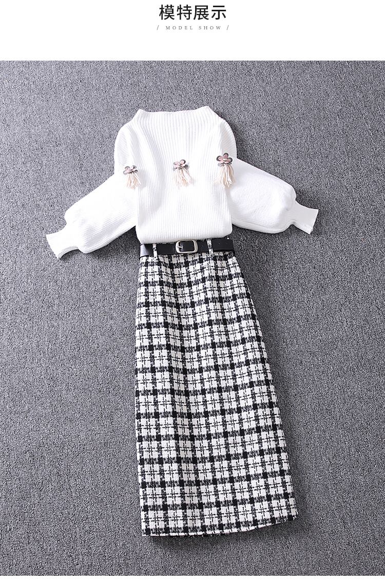 秋冬ツーピースセットレディースランタンスリーブアップリケプルオーバーセータートップ+ツイードチェック柄ベルトミディスカートスーツ オータム 秋物 ウィンター 冬物 ハーネス Rhc63935626838