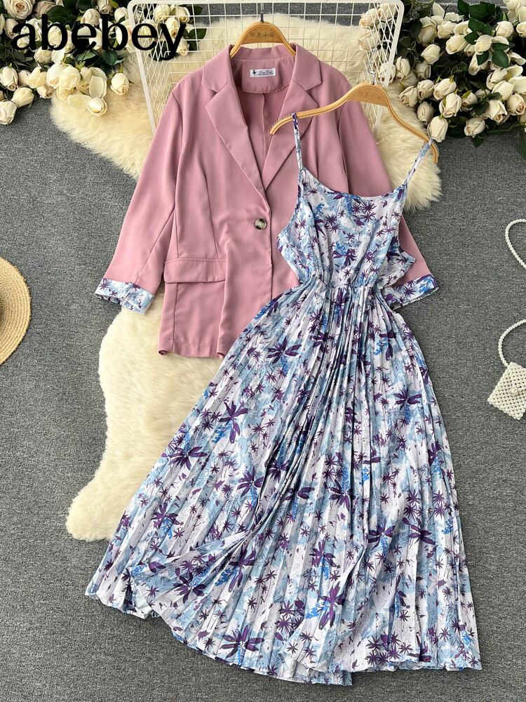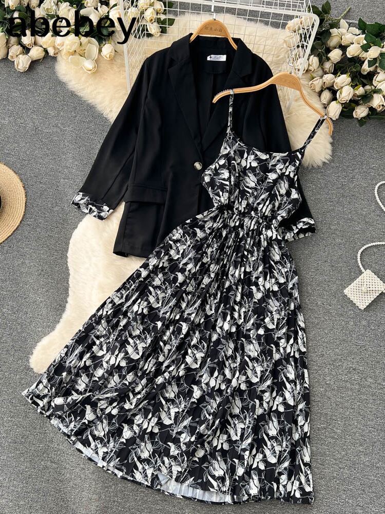 スプライスフローラルプリントドレスツーピーススーツキャミスロングドレスパッチワークスーツ襟コート女性OL秋セット オータム 秋物 花柄 Abe55769386069