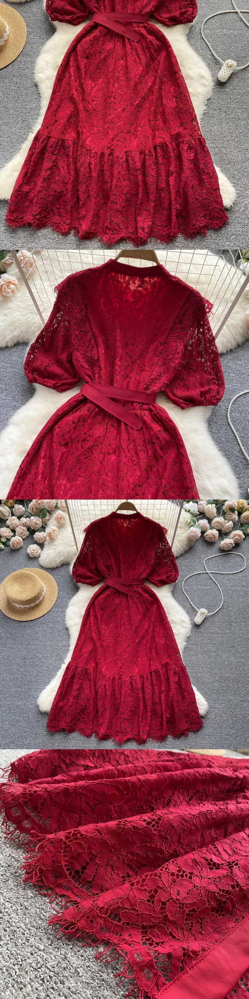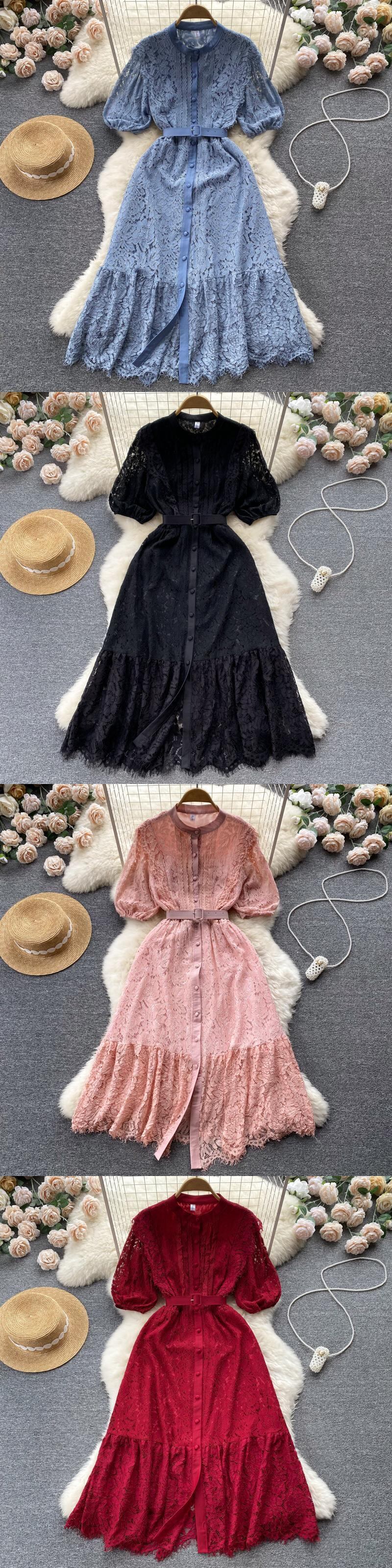 パッチワークレースの女性のドレス半袖レトロベルトスリムドレスフレンチシングルブレストスプリットスウィートマキシロングドレス ショート ハーフスリーブ 大人ガーリー キュート カジュアル ハーネス Abe45928015821