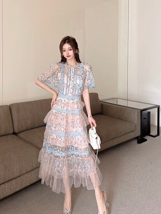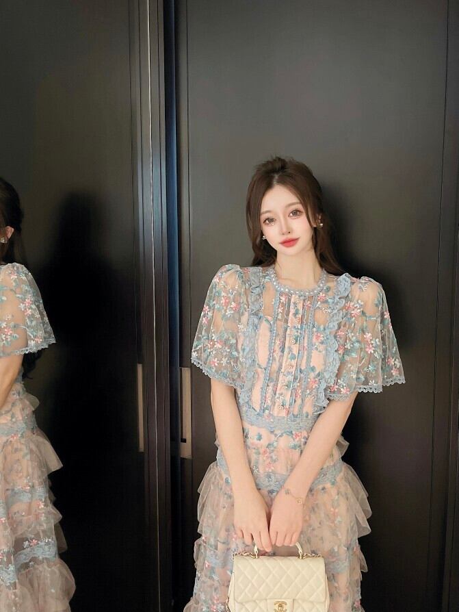 女性ウエディングドレスサマー半袖フローラルプリントメッシュフリルカスケードロングマキシウェディングイブニングパーティードレス ショート ハーフスリーブ ラッフル 夏物 花柄 Rhc36166948459