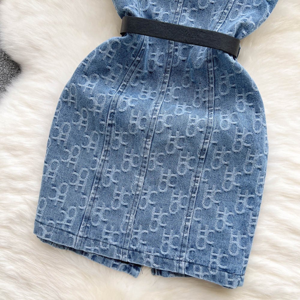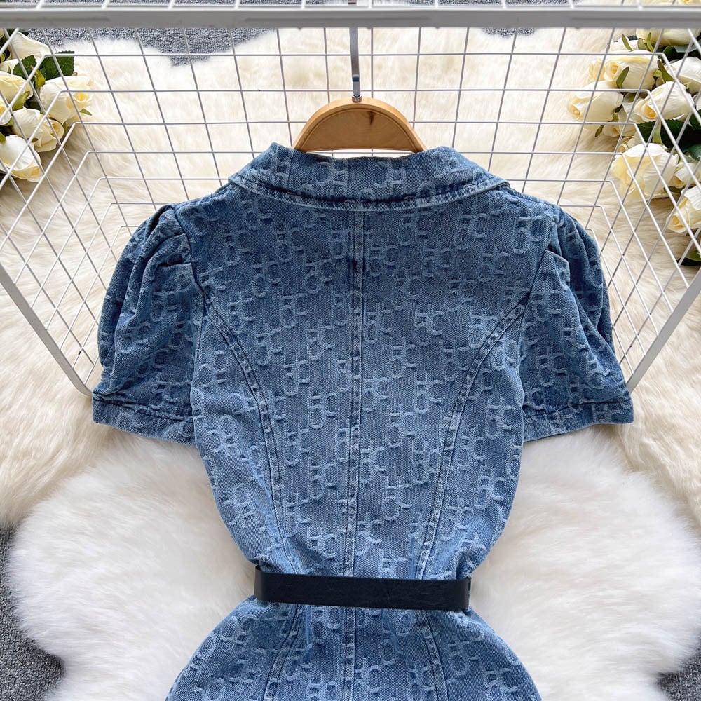 女性Aラインミニデニムドレスサマーシングルブレストショートパフスリーブフローラルスプリットジーンズショートドレス 夏物 花柄 Abe33753311576