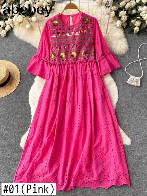ローズレッド2022サマーレース刺繡ドレス女性半袖ドレスパーティービーチマキシロングドレス ショート ハーフスリーブ 刺繍 夏物 Abe87086934724