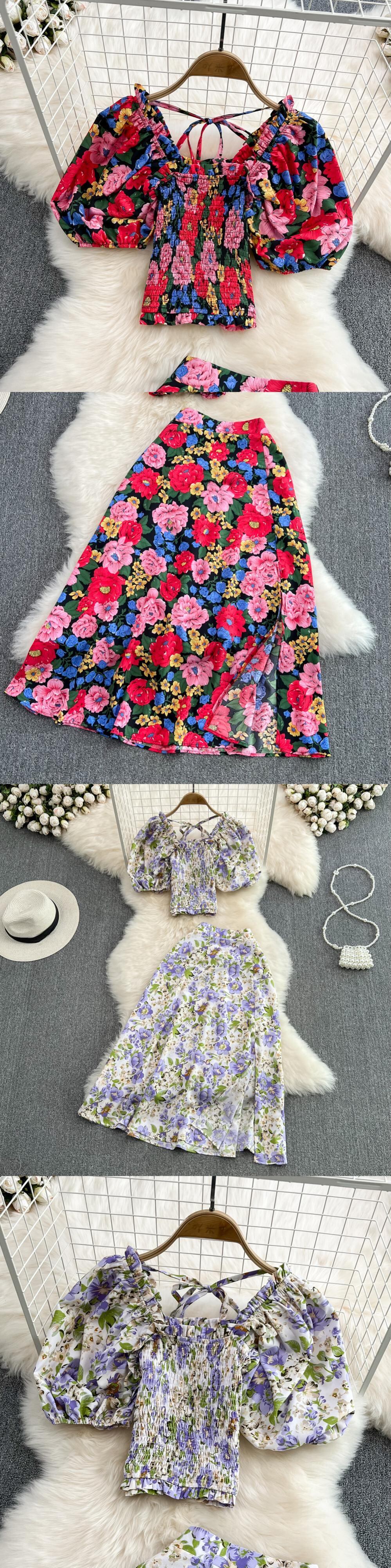 夏のボヘミアン女性花柄プリントツーピースセットセクシービーチスーツスクエアカラーパフスリーブショートトップス+スカート2022 サマー 夏物 スクウェア Abe15917194769