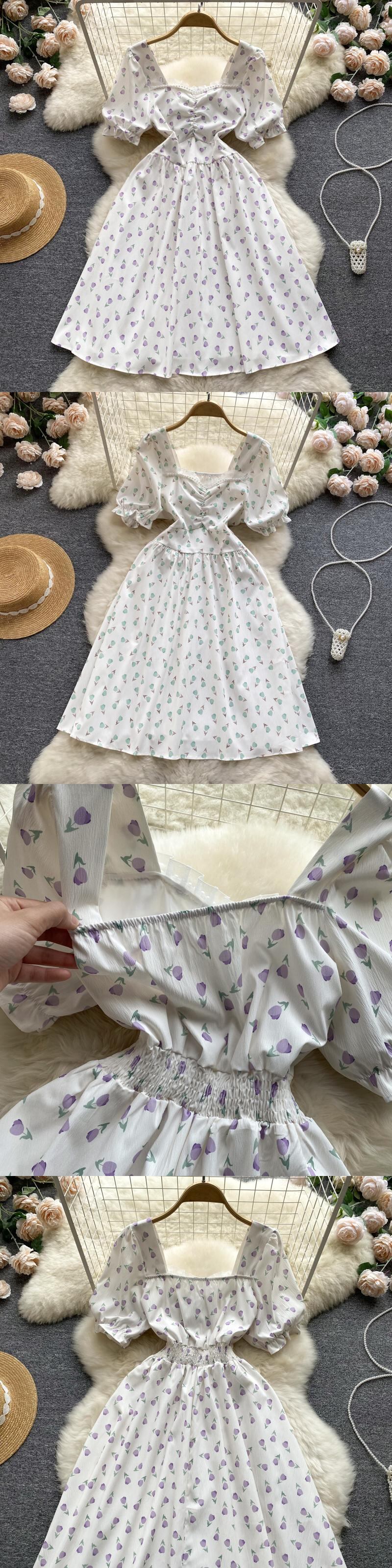 花柄ドレス女性スクエアカラー女性ドレスパフスリーブフリルドレス2022Vestidos ラッフル スクウェア Abe14070498834