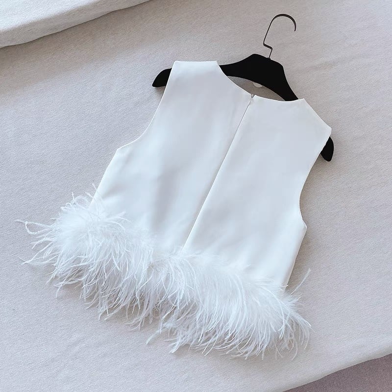 シャツトップレディースブラックパッチワークフェザーラウンドネックノースリーブスリムトップス2022夏 サマー 夏物 Oネック Rhc64659092767