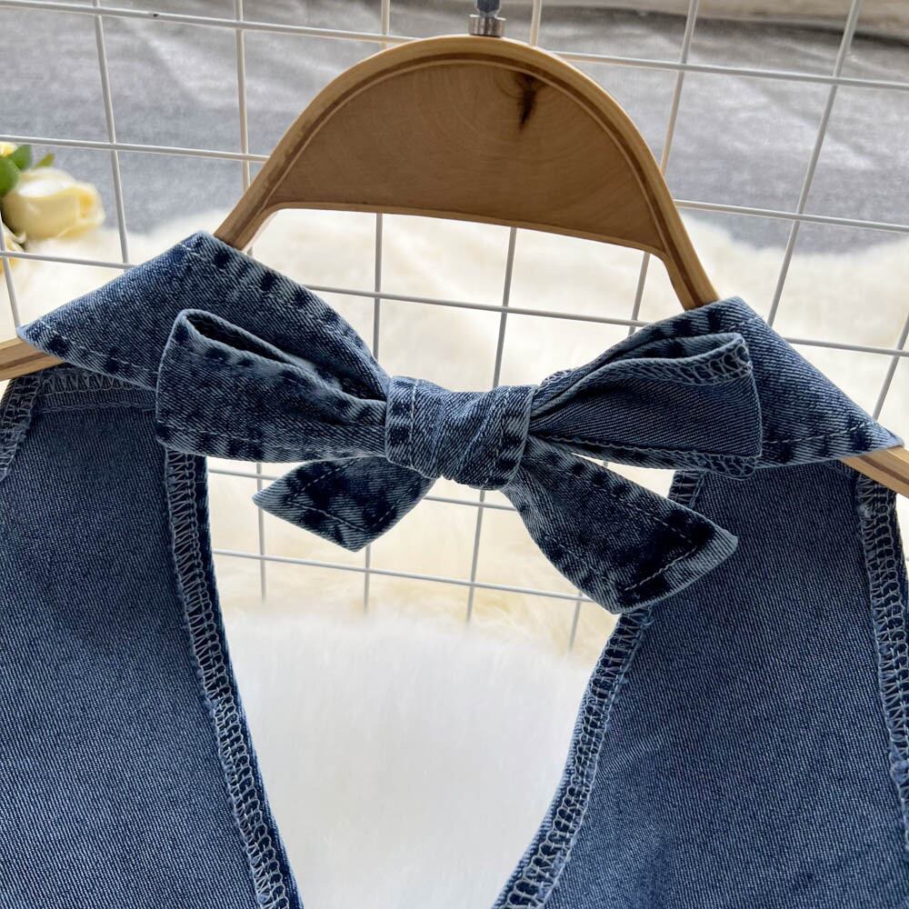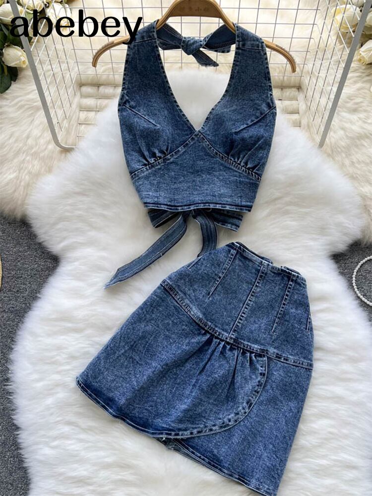 サマーブルーデニムツーピーススカートセットレディースジーンズストリートウェアローカットストラップホルタークロップトップ+ミニボディコンスカートクラブセット 夏物 Abe94191868824