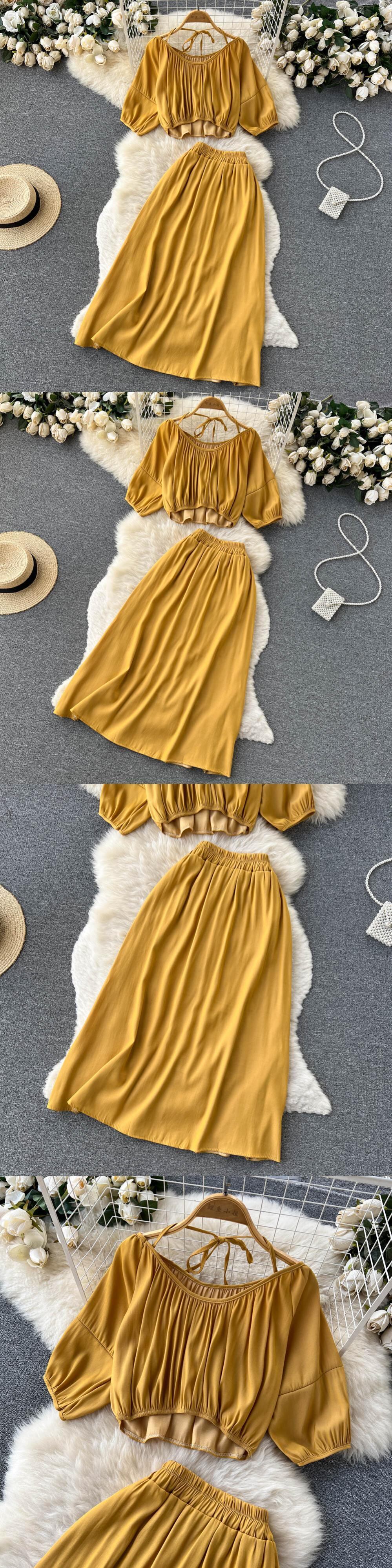 夏の女性ツーピースセット無地スラッシュネックパフ半袖トップス+ウエストAラインスカートスーツ ショート ハーフスリーブ サマー 夏物 ソリッドカラー Abe85741978654