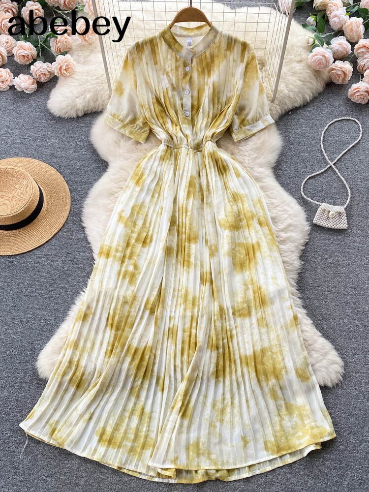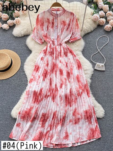 女性プリーツプリントフローラルドレス半袖シングルブレストAラインドレスサマーストリートウェアVestidos ショート ハーフスリーブ 夏物 花柄 Abe46997453692