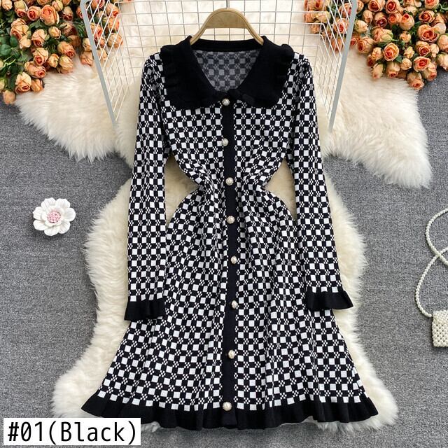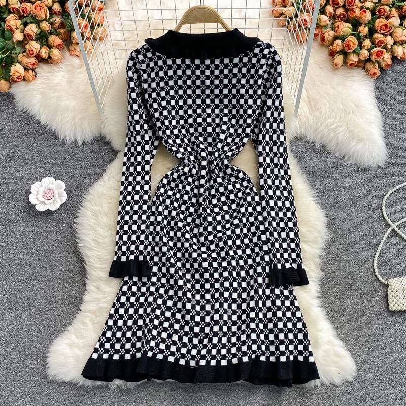 シックな膝ニットドレス秋のスリム長袖チェック柄ドレス女性2021Vestidos ロング オータム 秋物 Rhc20026105464