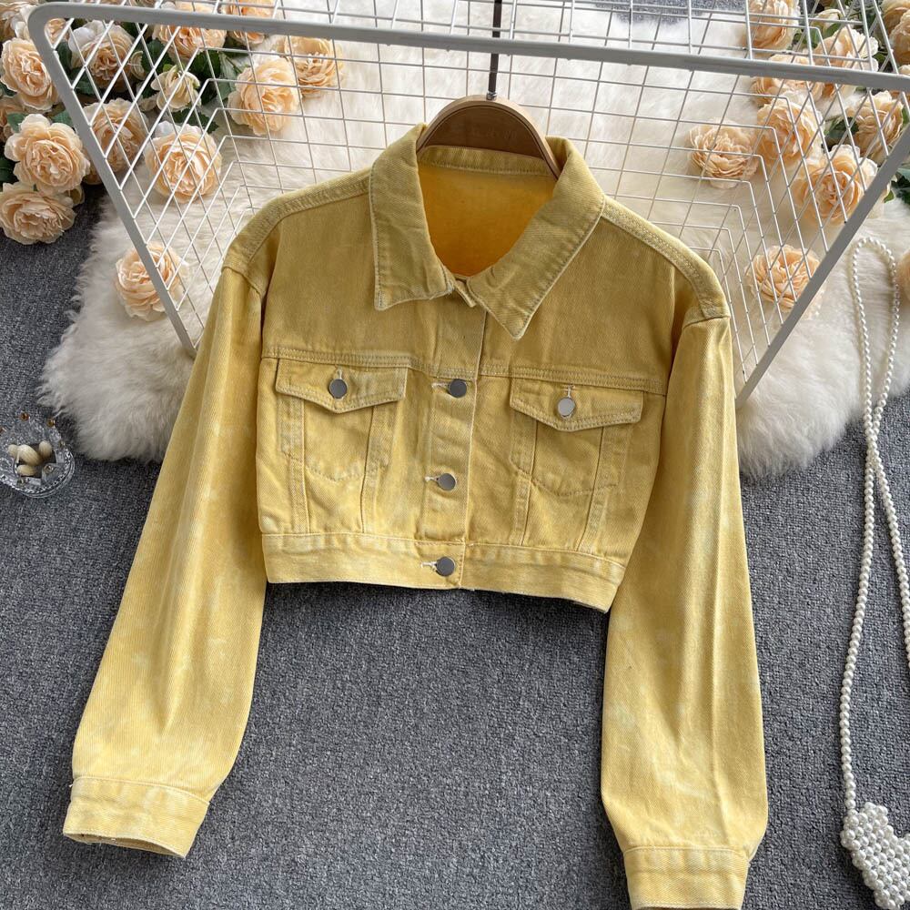 黄色のクロップドデニムジャケット女性2022ボタンポケット付きパフスリーブコート秋のストリートウェア破れたジーンズアウター オータム 秋物 Abe58726094324