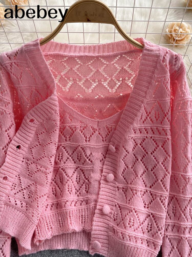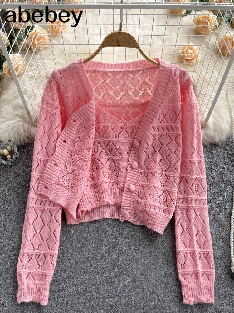スタイルツーピースセットカーディガン女性セクシーな秋のキャンディーカラー長袖リブ編みニットクロップドセーターとお揃いのベスト ロング オータム 秋物 Abe70344262942