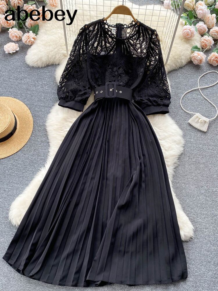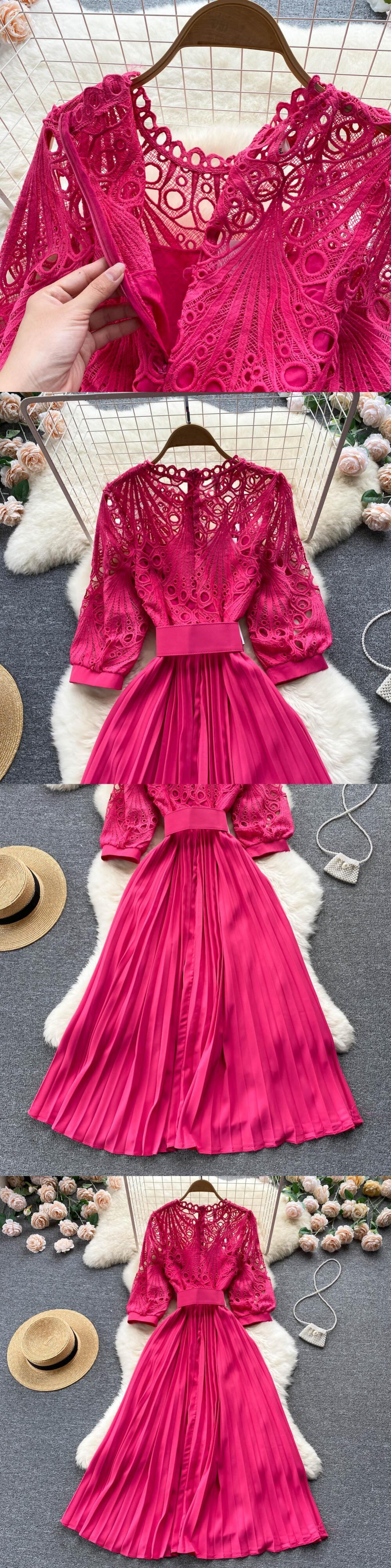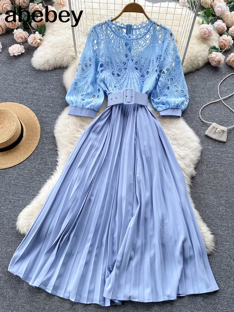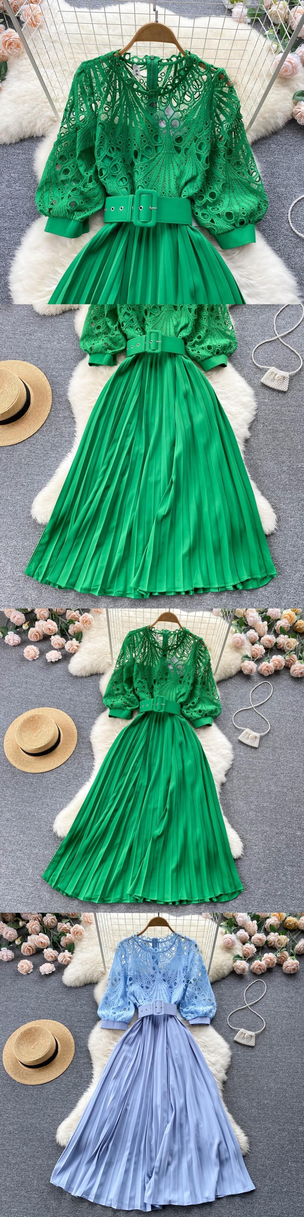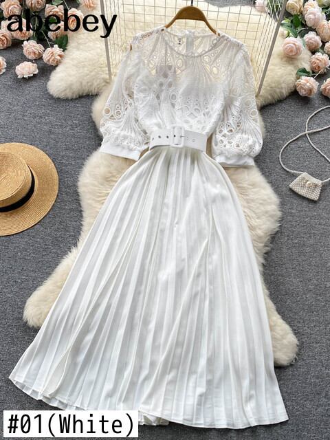 中空アウトレース花刺繡ドレス夏の女性ショートランタンスリーブウエストサッシマキシロングドレス 刺繍 サマー 夏物 花柄 Abe92454215707