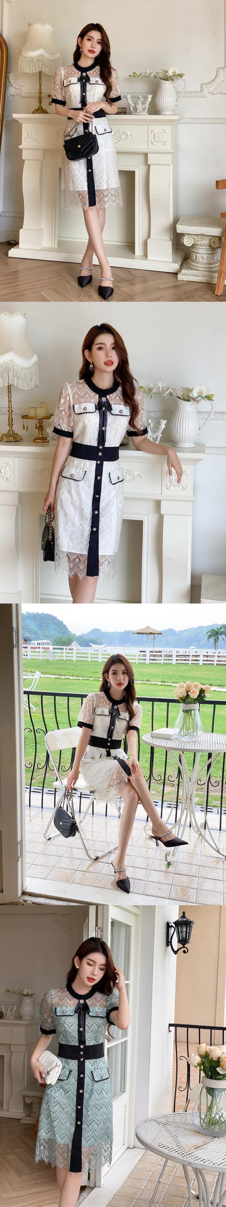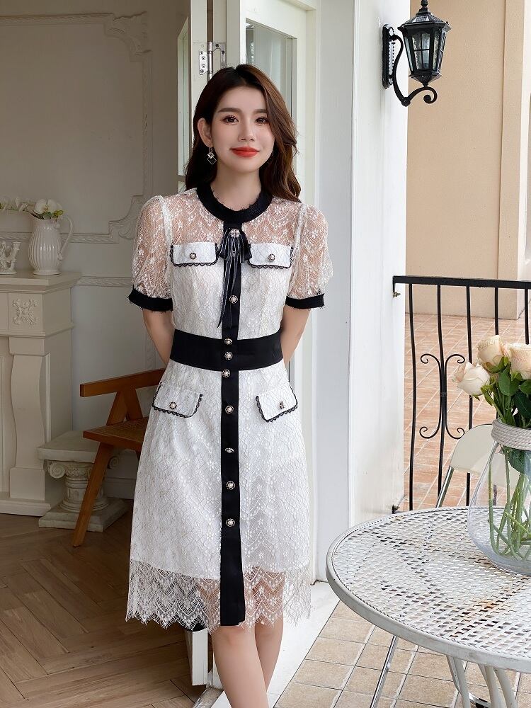 高級滑走路レースパッチワーク膝丈ドレス女性ボウOネック半袖パールボタン ショート リボン ハーフスリーブ 真珠 Rhc21763310862