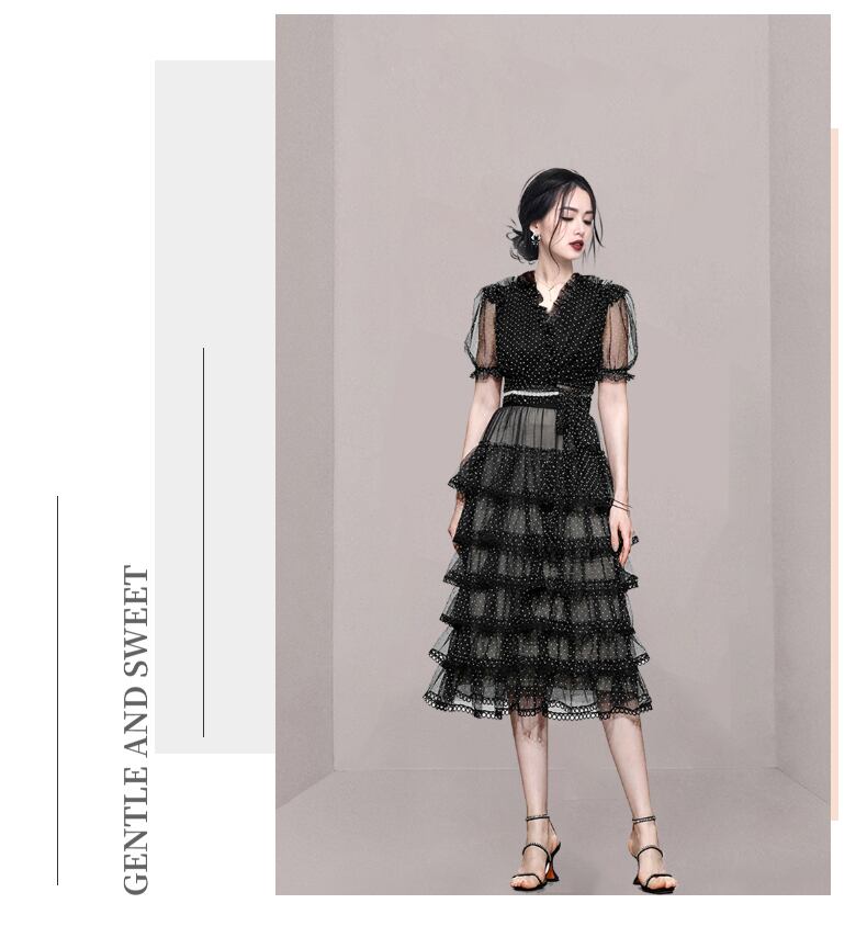 サマーメッシュツーピースセットレディースVネック水玉レースアップブラックトップス+レイヤーフリルケーキロングスカートスーツ ラッフル 夏物 Rhc45157070964