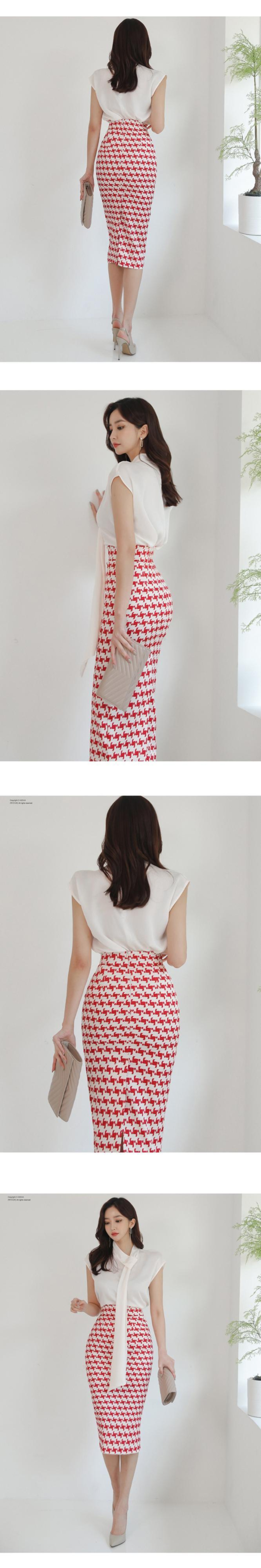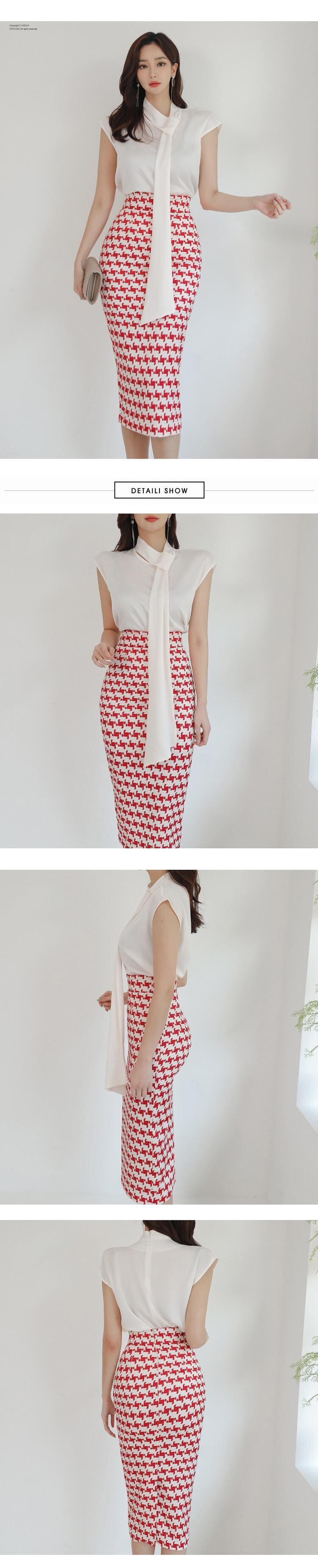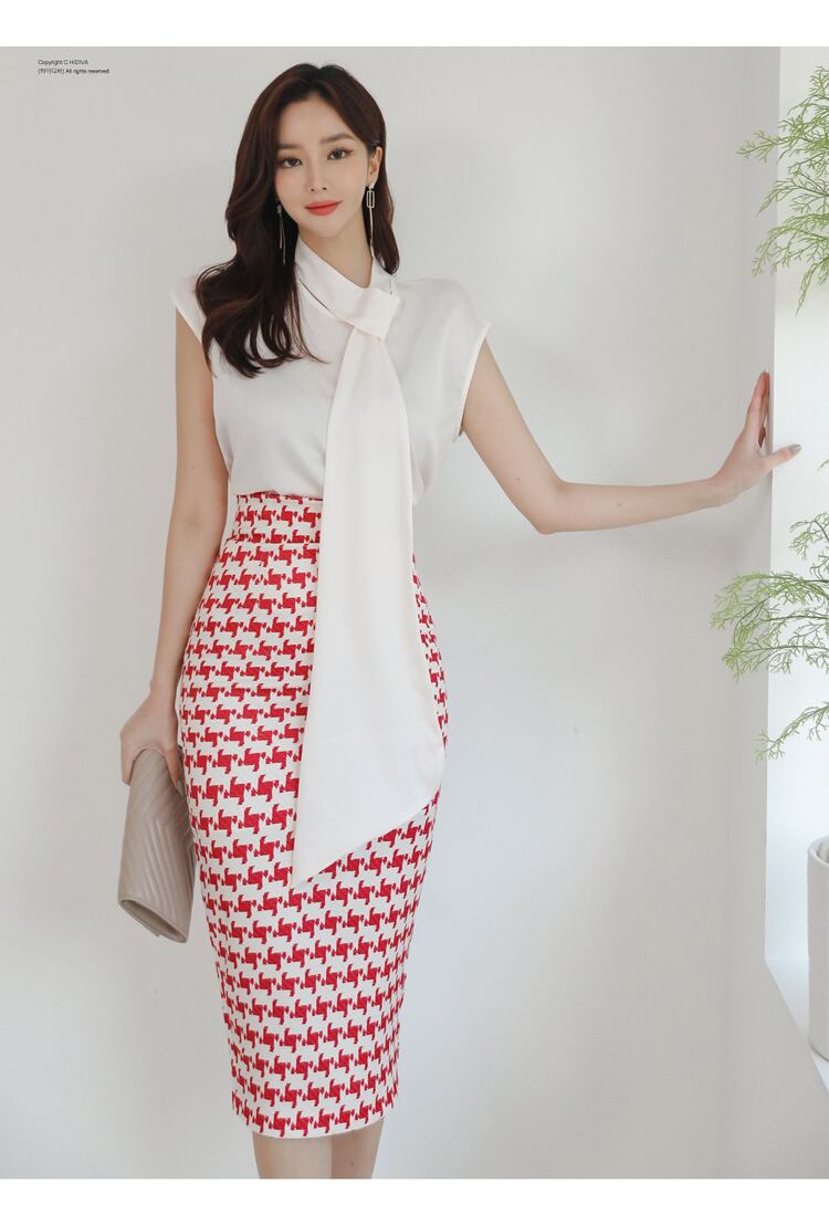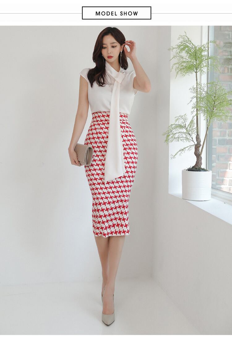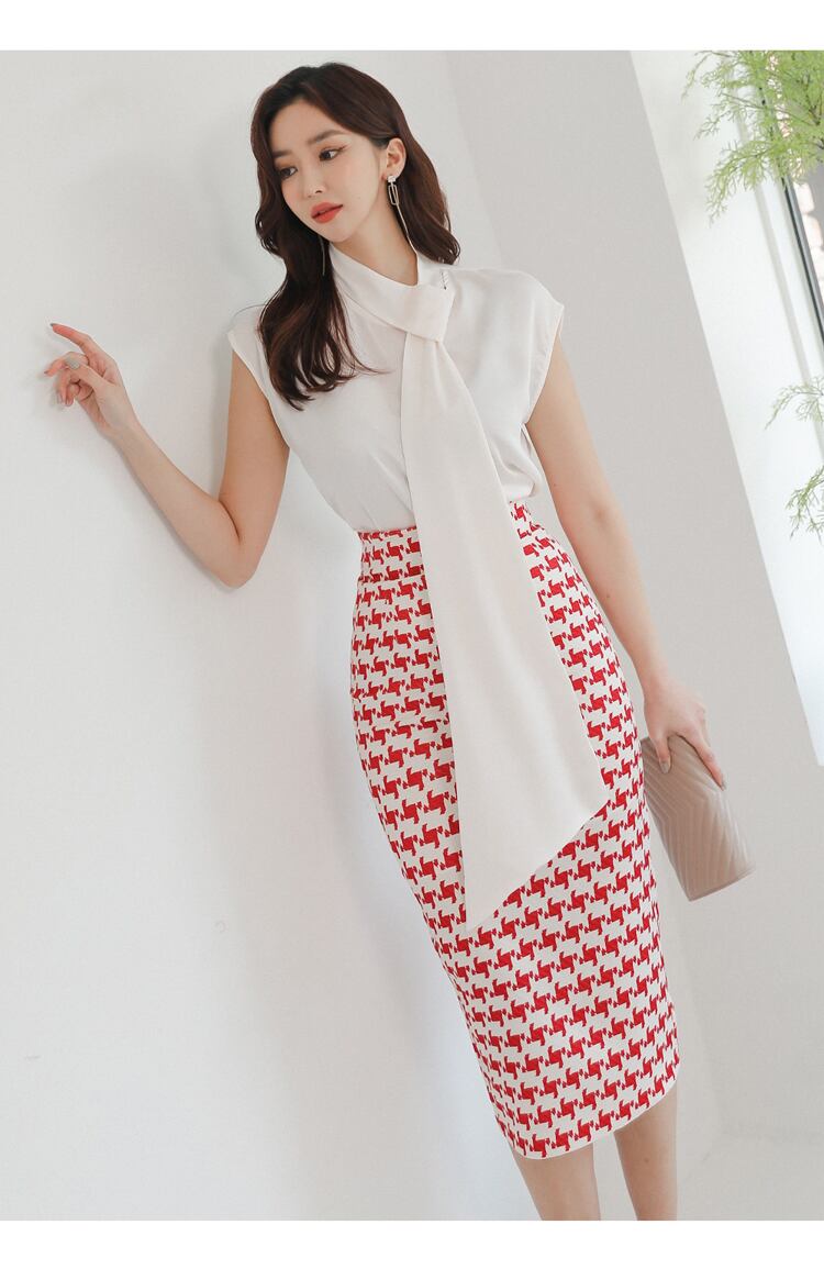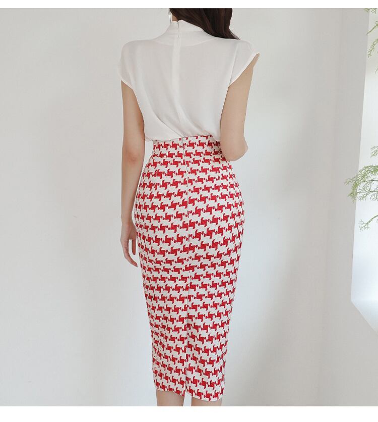 女性の2022年夏の作業服セットシフォンスリーブブラウスと赤い千鳥格子シースペンシルボディコンスカート レッド サマー 夏物 Rhc13329683881