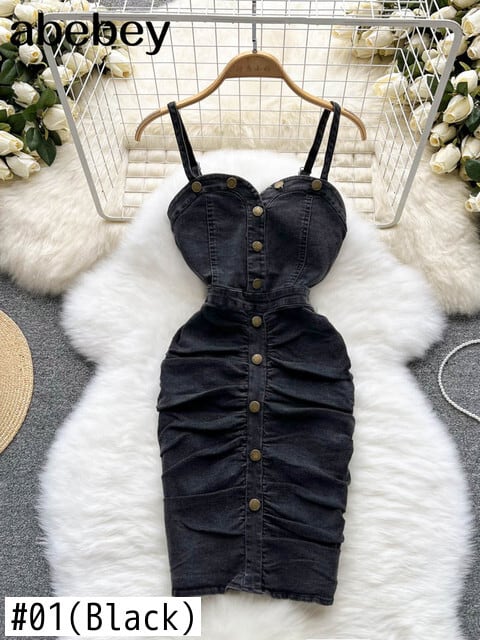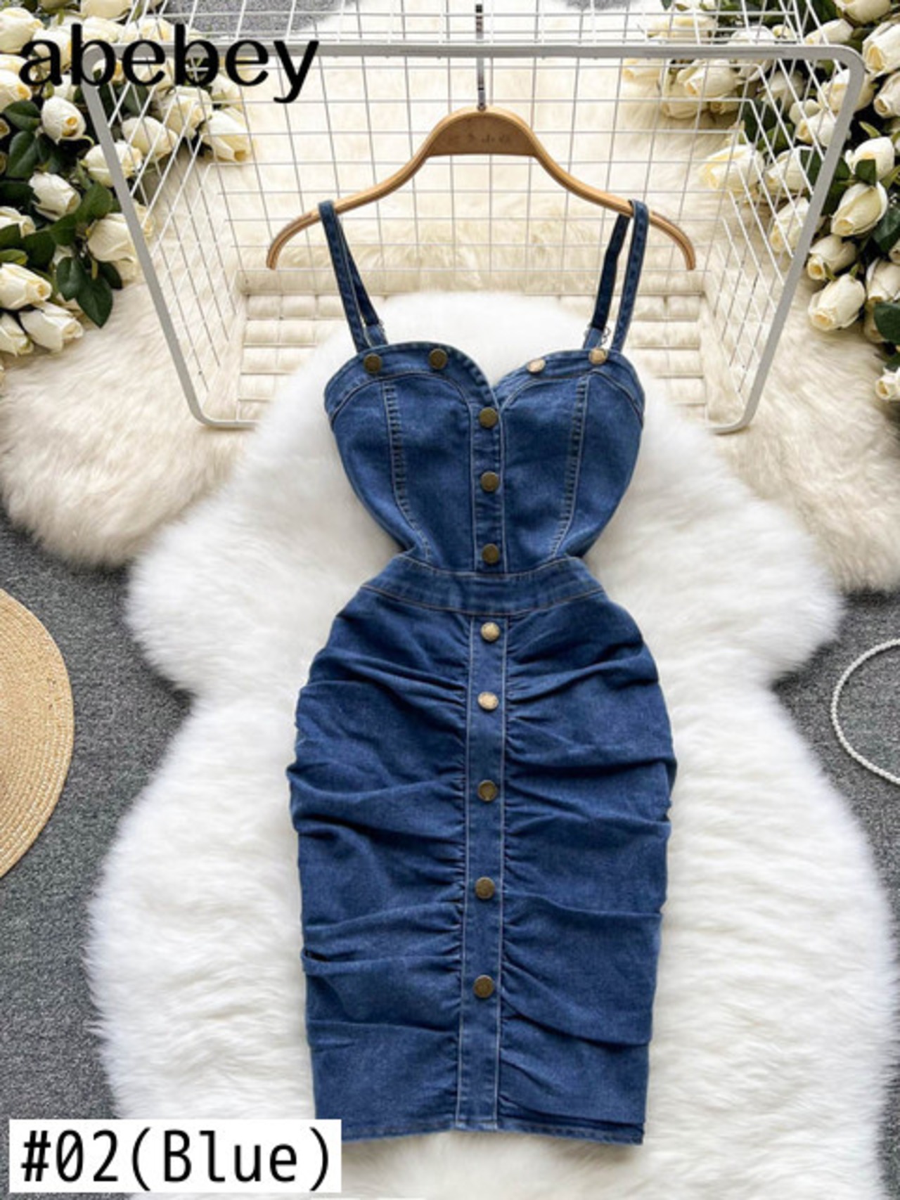 スパゲッティストラップセクシーデニムドレス女性2022年春夏シングルブレストボディコンミニドレスクラブパーティーウェアジャンドレス スプリング 春物 サマー 夏物 Abe8052072842